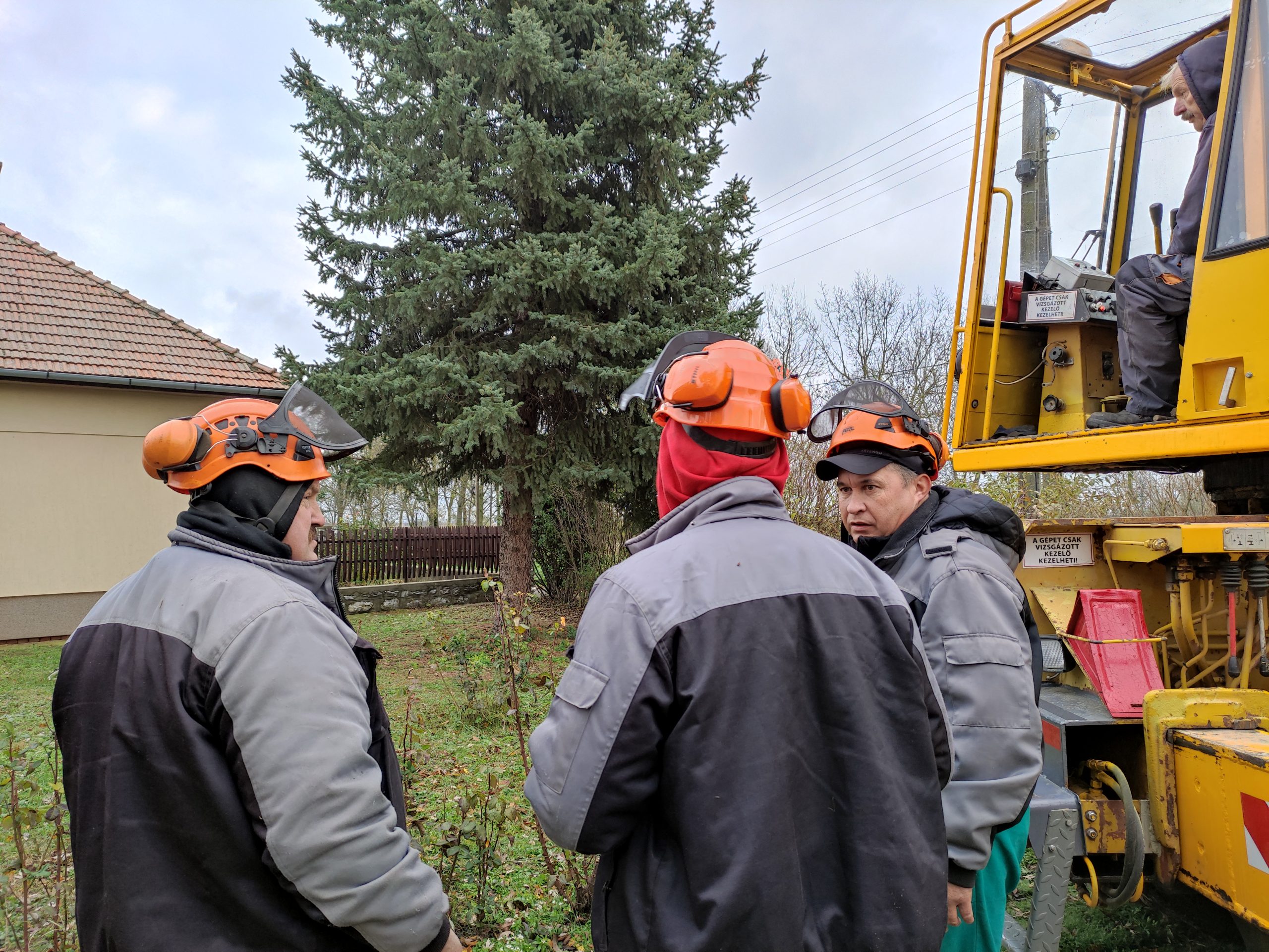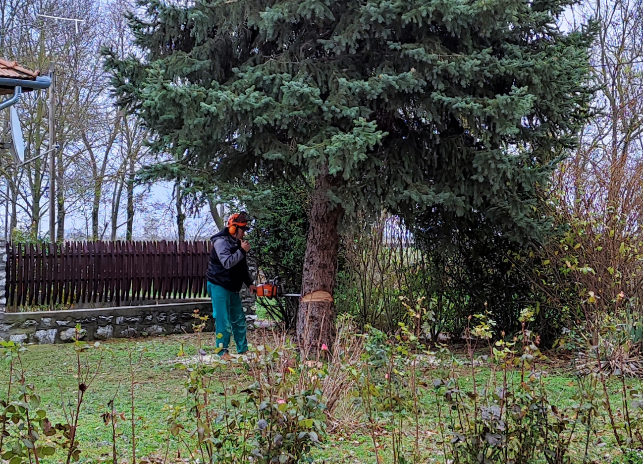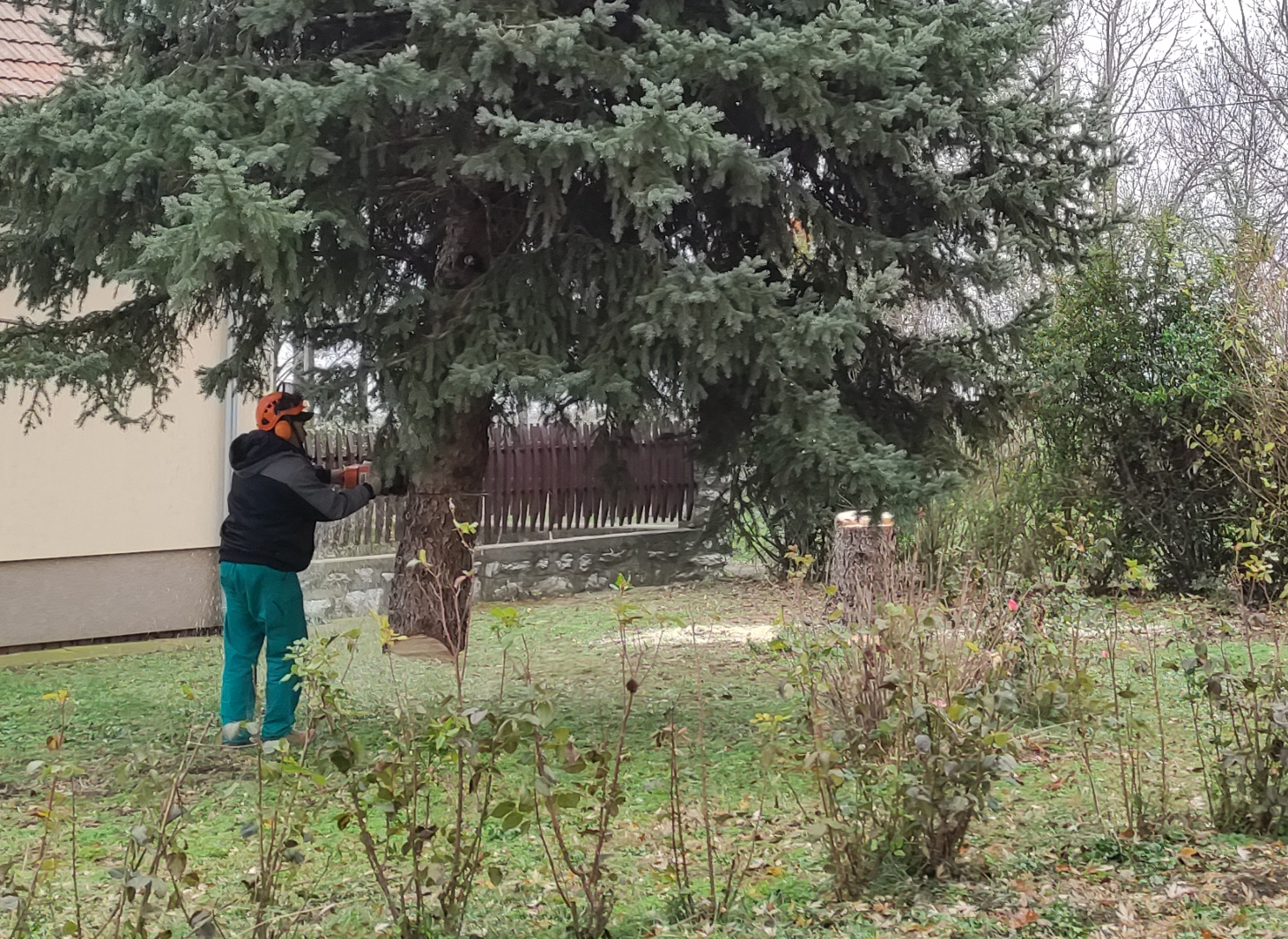 Így vágták ki a város idei karácsonyfáját az erzsébeti Vasvári utcában.