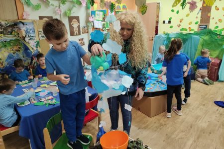 A gyerekek csoportokban építettek vizes élőhelyet, horgásztak ki a hajó környékéről vízi állatokat, végeztek érdekes kísérleteket vízzel, borotvahabbal és ételszínezékkel, festettek, és vízi állatokat is készítettek. És többször is kitörtek a csoportszoba egyik sarkában a szódabikarbóna-vulkánok.