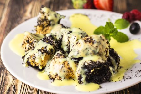 3. Felvágjuk a kifliket, meglocsoljuk őket a vaníliaszósszal és megszórjuk mákkal, és már fogyasztható is.