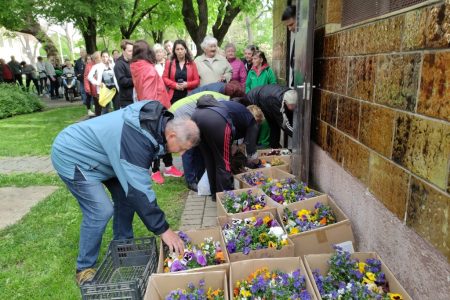 Az egykor nyilvános vécének használt zöld csempés épület előtt már háromnegyed 8-kor szépen sorba álltak az emberek, hogy részesüljenek a város által kiosztandó árvácskapalántákból. Ezeket reggel 8-tól osztották szét, s a nagy érdeklődés miatt Márki-Zay Péter polgármester azt mondta, hogy az első körben mindenki tíz tövet kap, majd, ha marad még a palántákból, akinek még kell, az ismét sorra kerül.