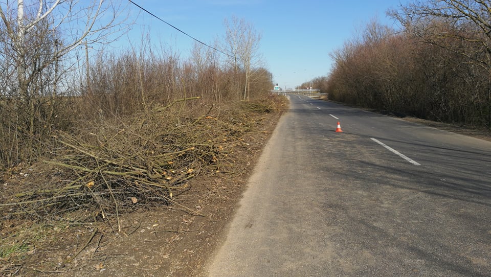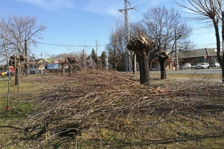 Ugyancsak fákkal kapcsolatos, de kissé másféle munkálatok is folynak jelenleg a városban. A Rárósi út mellett a belógó gallyakat levágják, aprítógéppel összezúzzák, a mulcsot később használják fel. Ugyanezt a munkát hajtják végre hamarosan Öreg-Kishomokon.