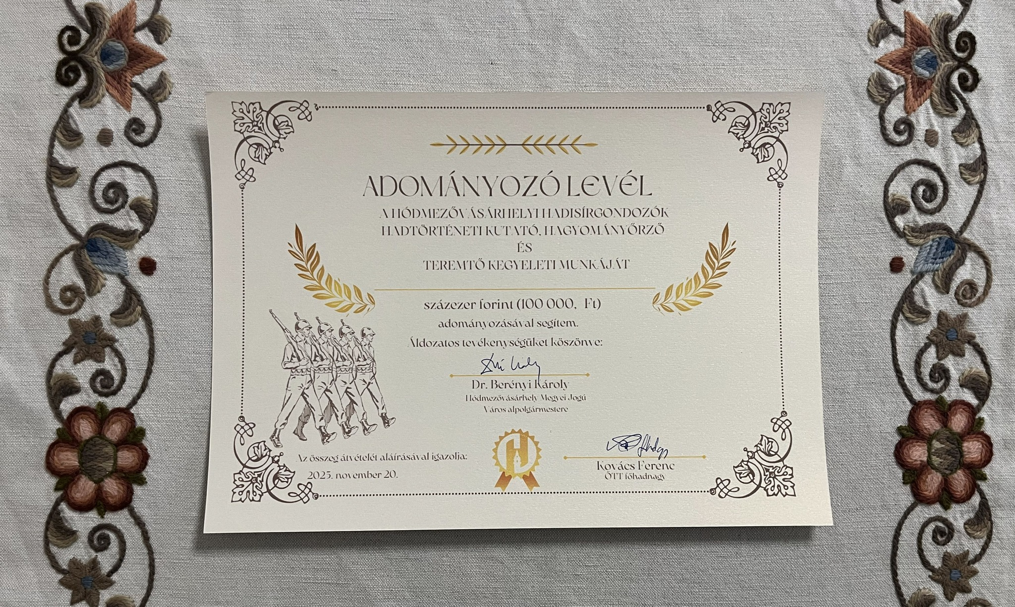 Ezért is döntött úgy Dr. Berényi Károly, hogy, mint 5 éve mindig, idén a 2025-ös évi munkájukat utólag támogatva 100 ezer forintot ad a Történelmi Vitézi Rendnek, hadtörténeti kutató, hagyományőrző kegyeleti tevékenységüket elősegítve. A támogatásról szóló, 100 ezer forint támogatást tartalmazó okiratot pénteken adta át az elpolgármester Kovács Ferenc tartalékos főhadnagynak.