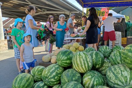 A Pap család három hete kínálja a Vásárhely határában termett görög- és sárgadinnyéit a vásárhelyi piacon, ahol ma is folyton-folyvást érkeztek a standjukhoz a vevők. Volt, aki hatalmas, egész görögdinnyével távozott, volt, aki ugyanennyi kért, de szeletelve, akadt, aki fél- vagy negyeddinnyét. A görögnél jóval kisebb sárgadinnyéket egészben vitték, s akadt aki egyenesen párosával.