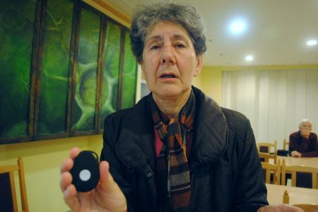A 119 lakó közül 33 igényelte a nagyon egyszerűen működő, nyakba akasztható eszközt, mellyel bármilyen baj esetén gyorsan lehet segítséget hívni. Bárhonnan. A képen Lavró Julianna a segélyhívóval.