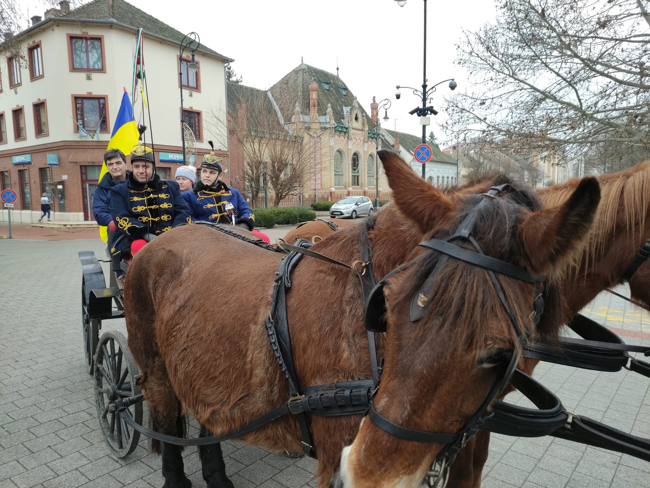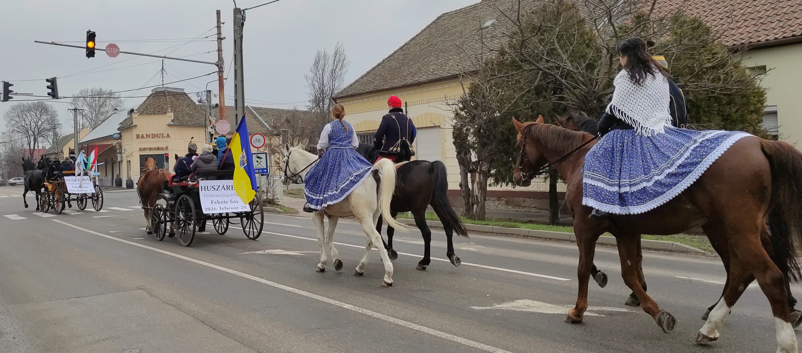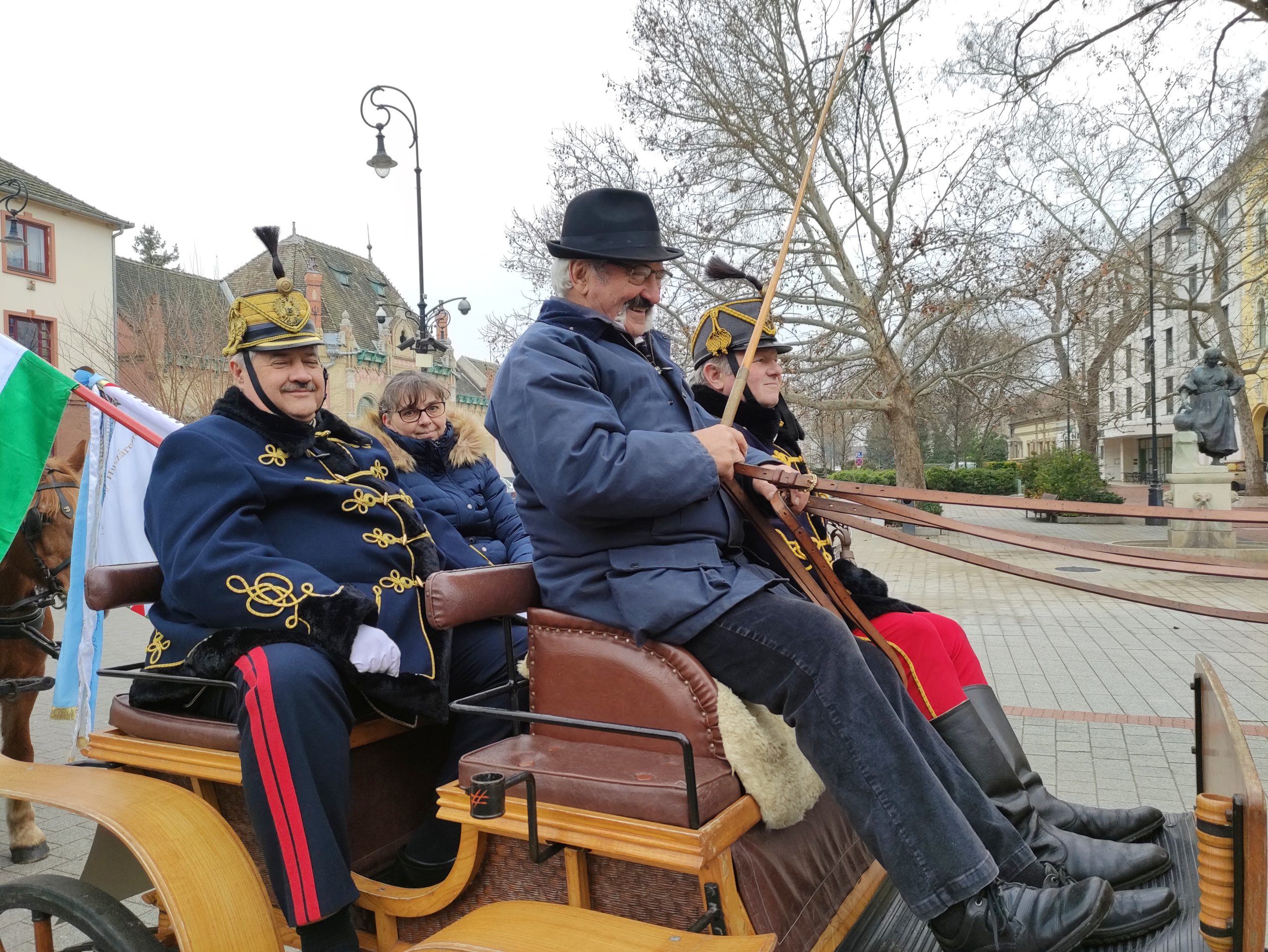 A közlekedők eleinte meghökkentek a lovasok és a kocsik felvonulásán, ám elolvasták a fogatok háttámlájára helyezett, a február 28-án este 7 órakor a Fekete Sasban kezdődő XVII. Huszárbált népszerűsítő táblákat és rögtön képbe is kerültek. A járókelők is érdeklődve figyelték a menetet, amely a Kossuth téren, a Fekete Sassal szemben meg is állt néhány percre, hogy onnan visszatérjen a kiindulópontra, a Serháztér utcába, bejárva a város másik felé is..