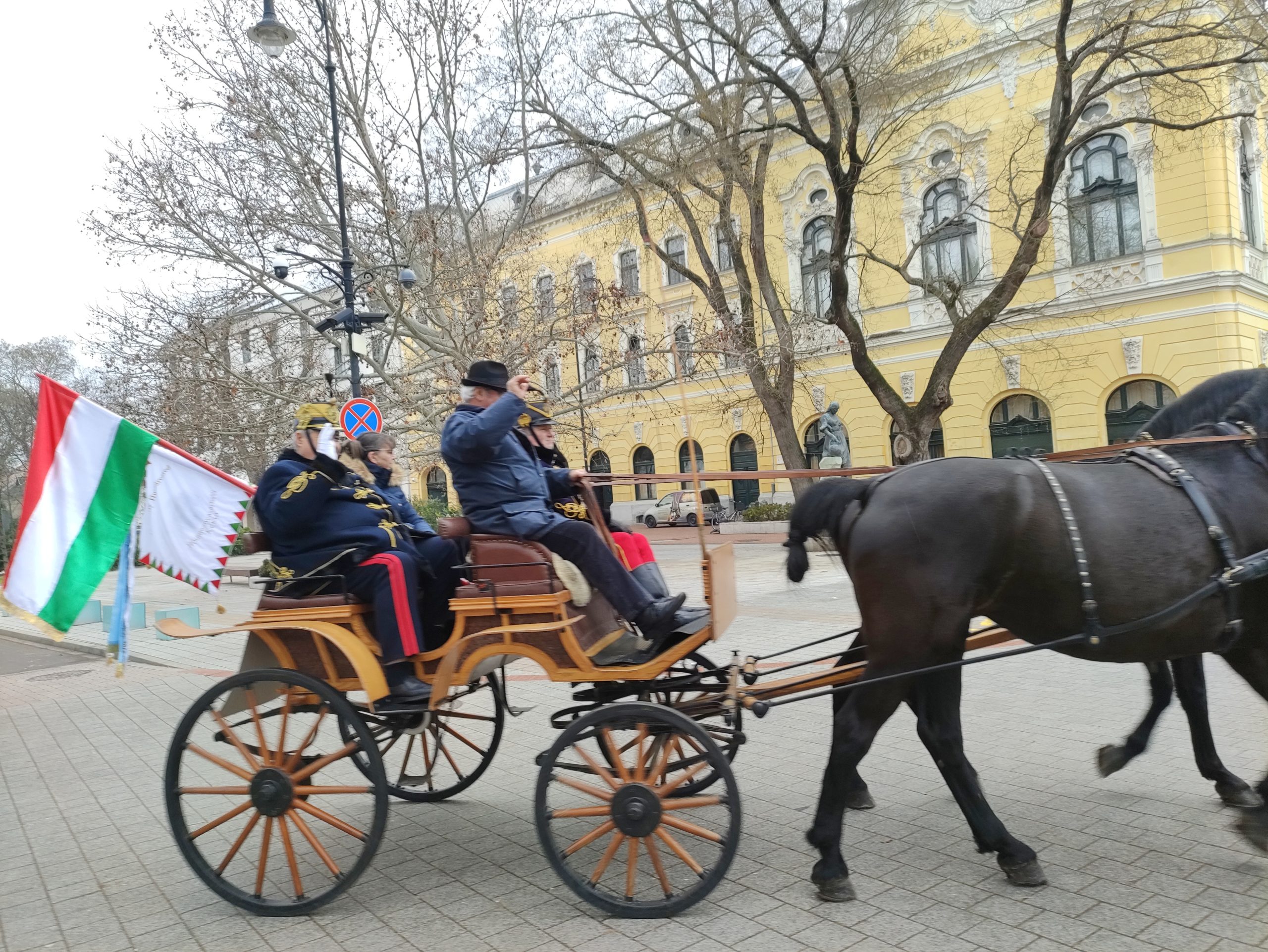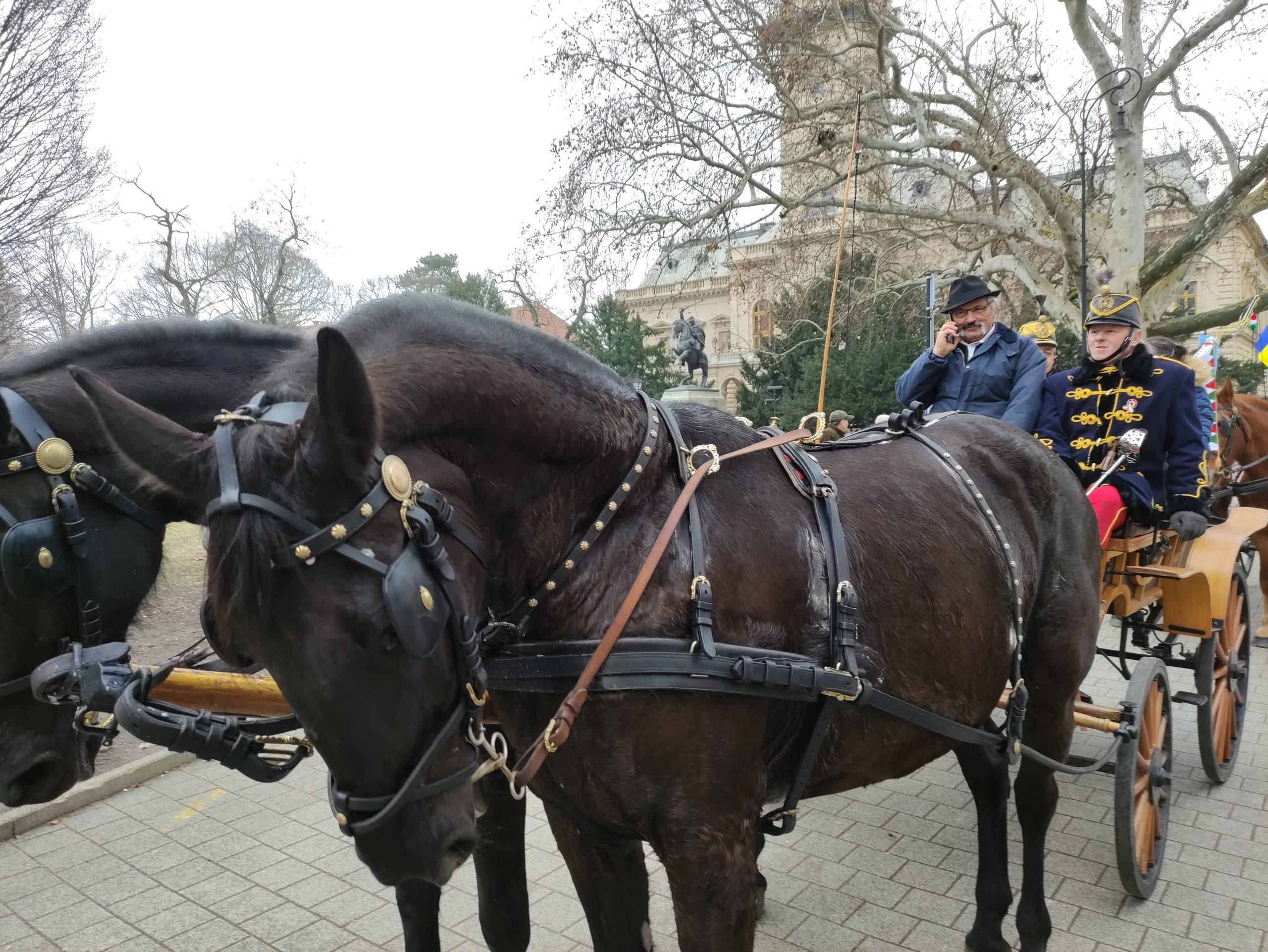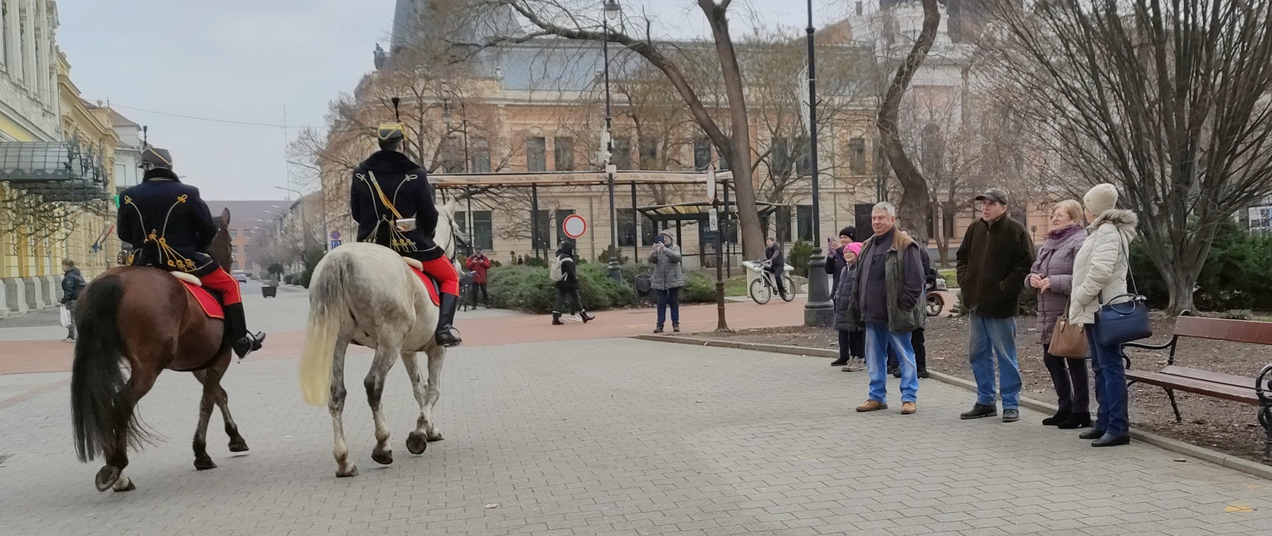 A közlekedők eleinte meghökkentek a lovasok és a kocsik felvonulásán, ám elolvasták a fogatok háttámlájára helyezett, a február 28-án este 7 órakor a Fekete Sasban kezdődő XVII. Huszárbált népszerűsítő táblákat és rögtön képbe is kerültek. A járókelők is érdeklődve figyelték a menetet, amely a Kossuth téren, a Fekete Sassal szemben meg is állt néhány percre, hogy onnan visszatérjen a kiindulópontra, a Serháztér utcába, bejárva a város másik felé is..