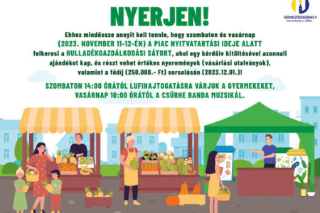 Múlt héten vasárnap ugyanis eső miatt elmaradtak a rendezvények. Ezúttal november 11-12-én lesznek a programok, melynek során aki felkeresi a hulladékgazdálkodási sátrat és kitölt egy kérdőívet, az azonnali kisebb nyereményben részesül, és részt vehet értékes utalványok sorsolásában. A fődíj pedig 250.000 Ft lesz.