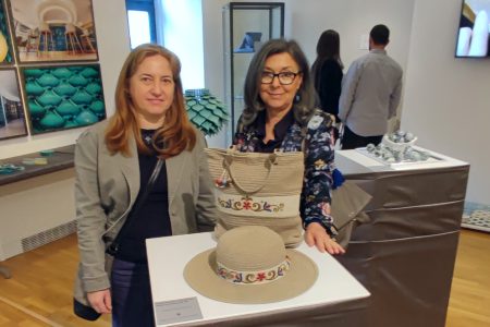 Magyar Kézműves Remek díjat kapott a Magyar Kereskedelmi és Iparkamara Magyar Kézműves Remek pályázatán a Hódfó vásárhelyi hímzéssel díszített horgolt nyári kalap-táska szettje, mely úgy trendi, hogy a hagyományokat is követi. A képen Fodor Györgyi és Blaskovicsné Zsuzsi a szettel.