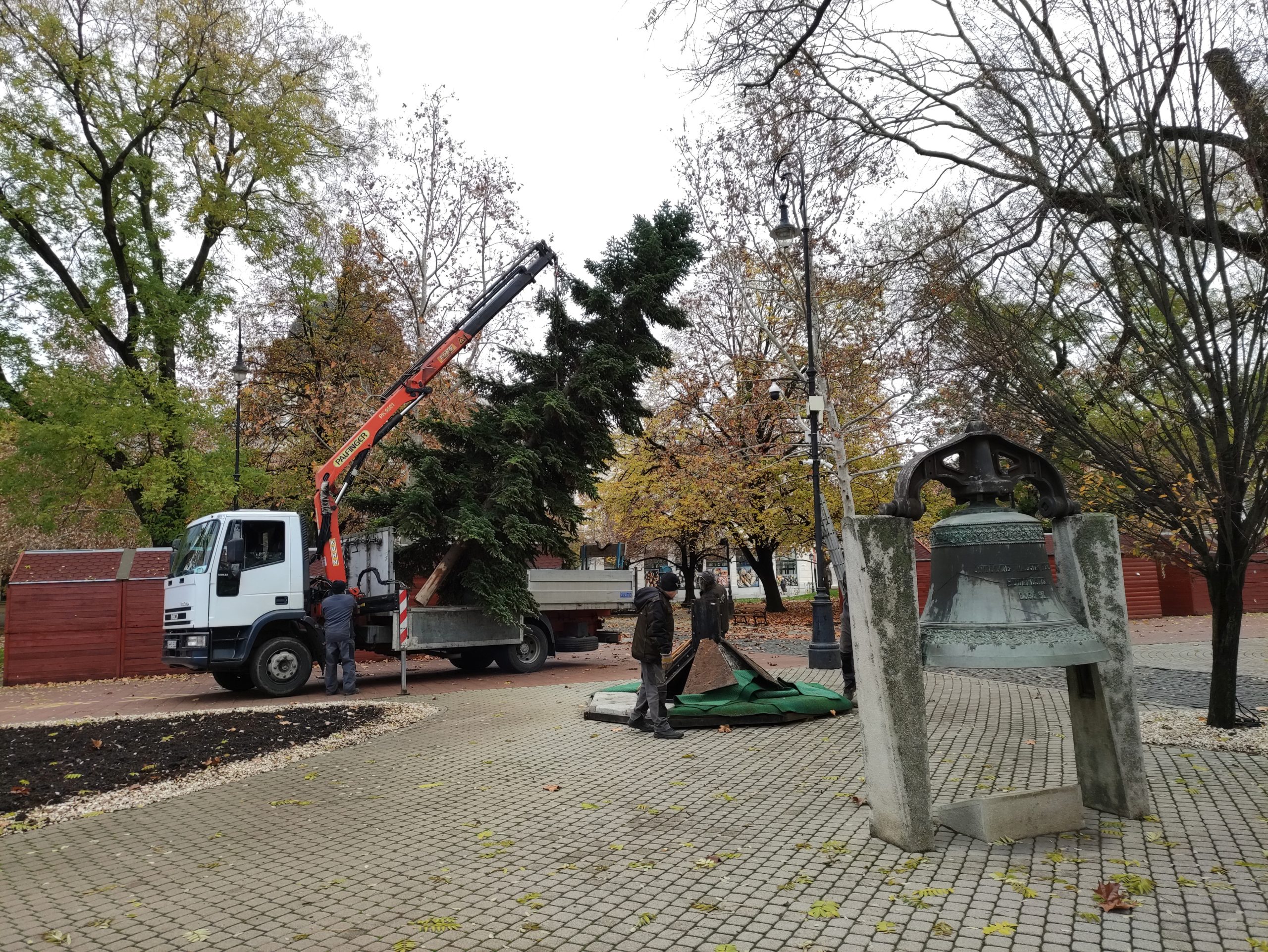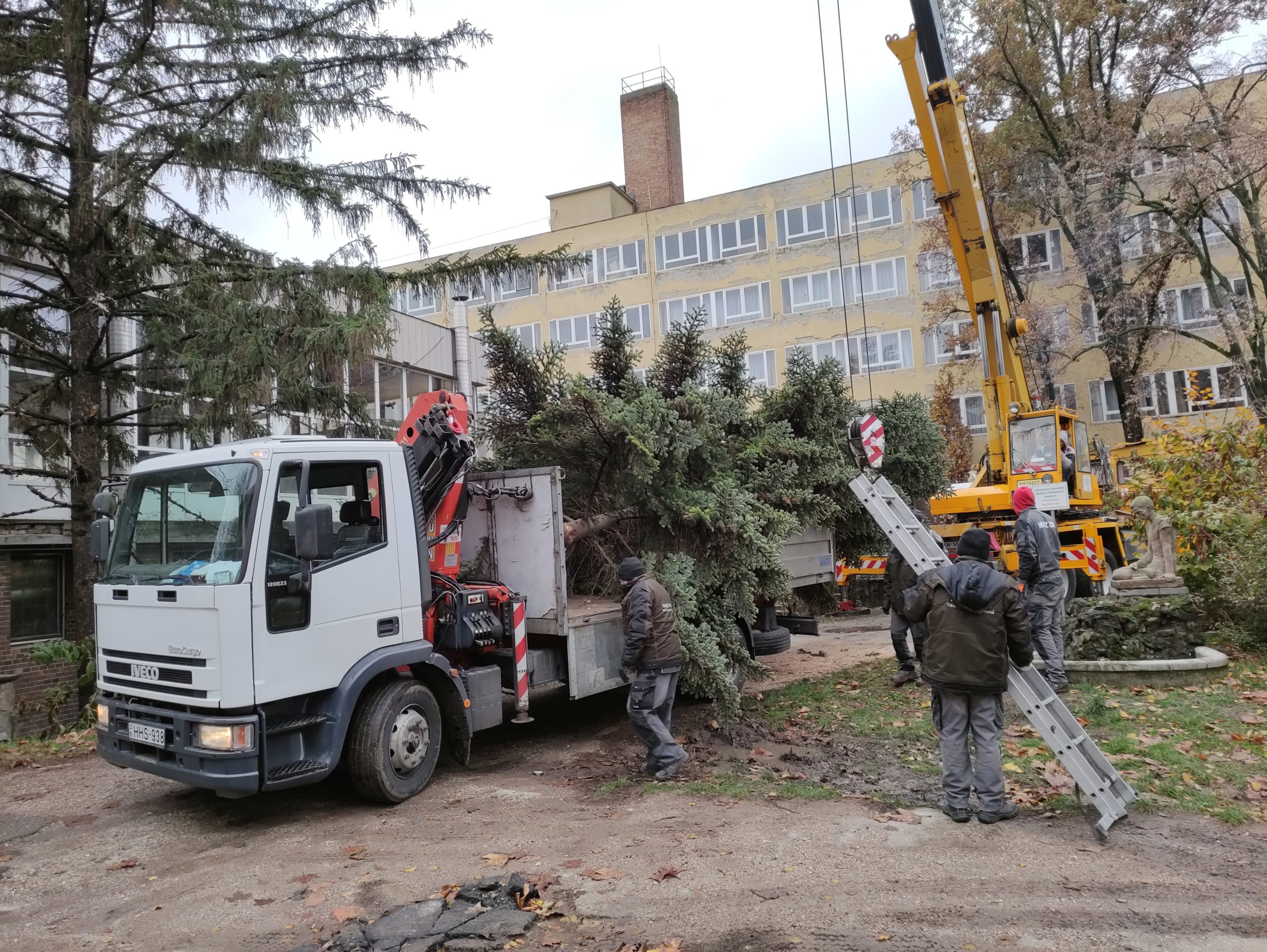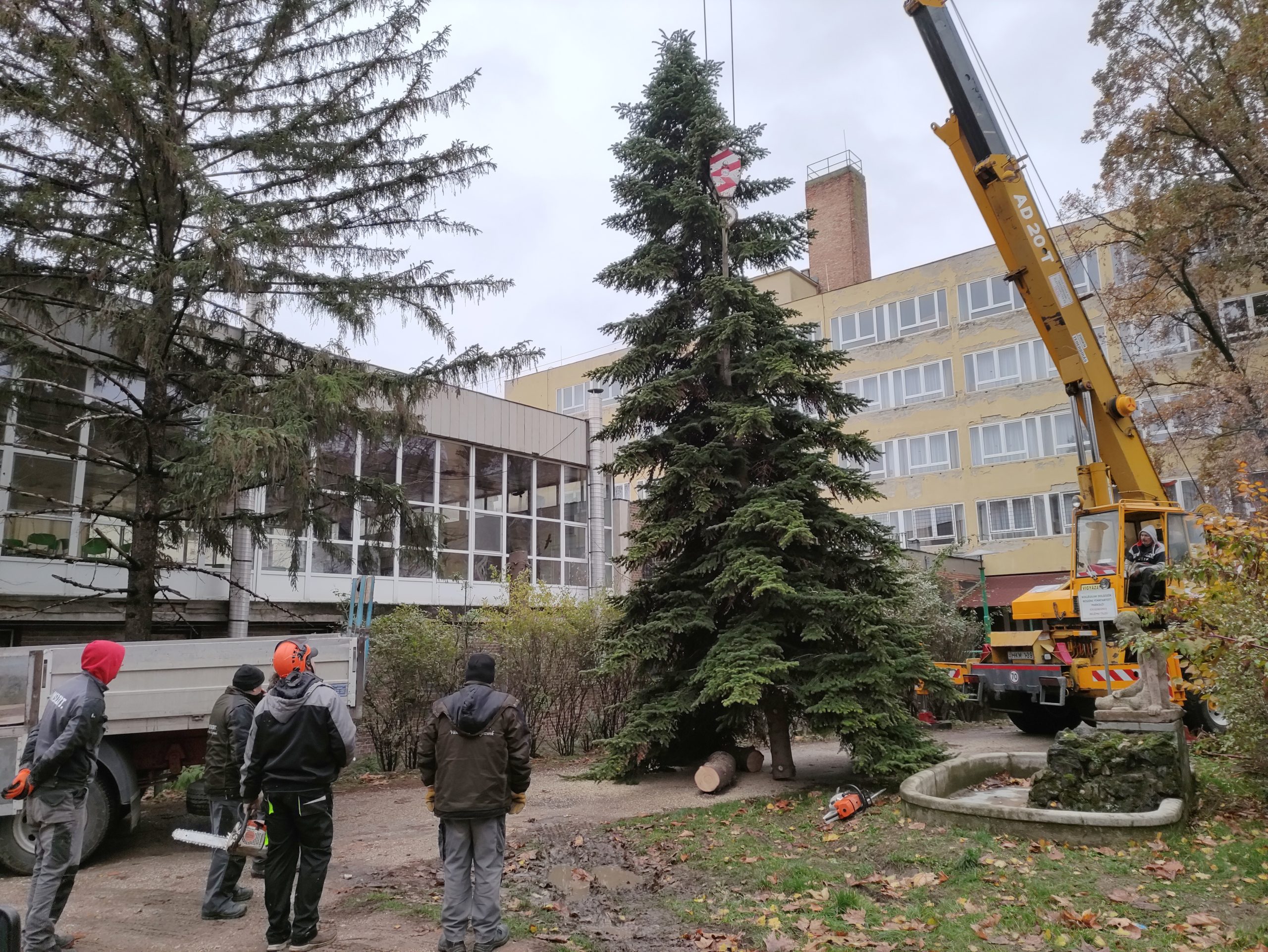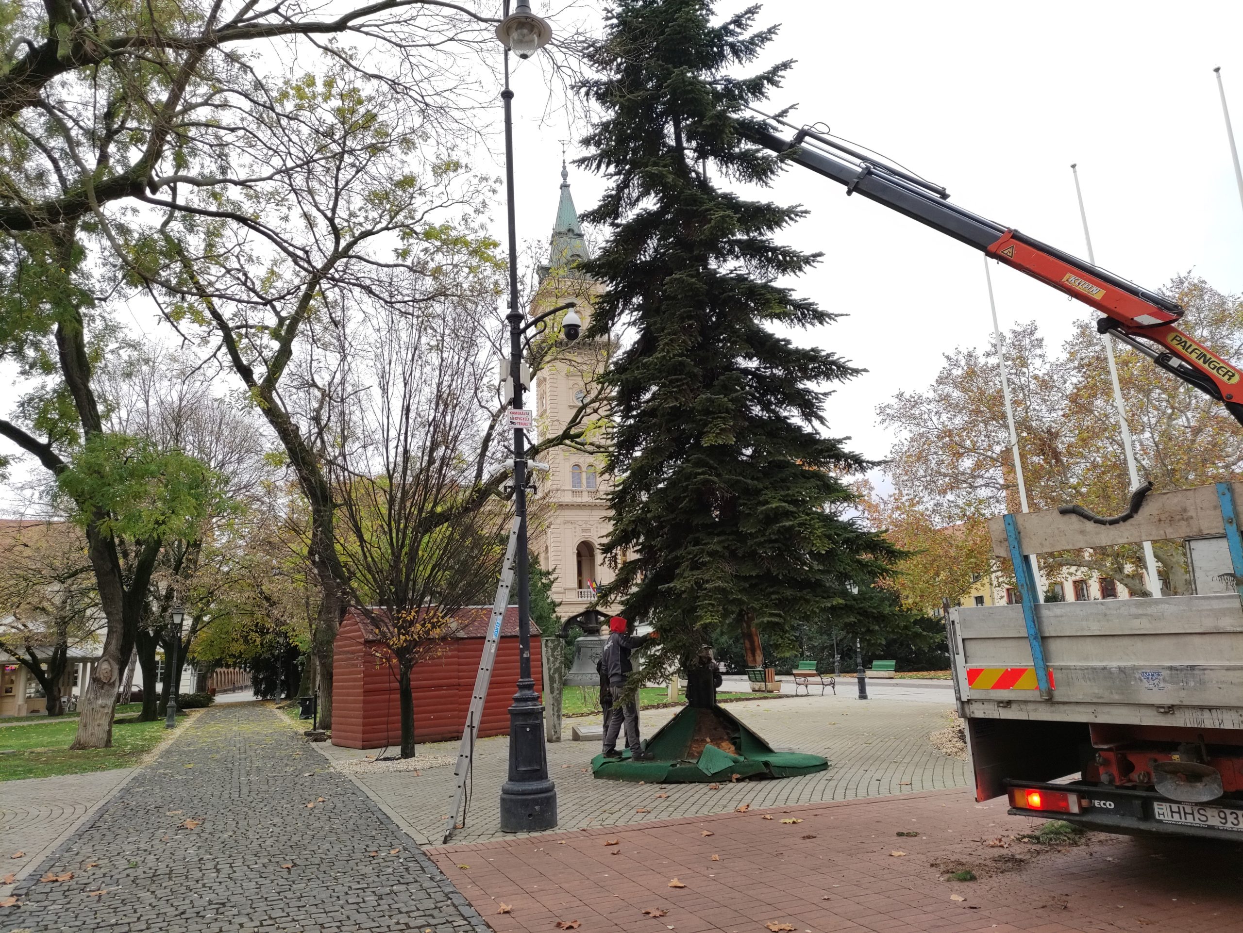 A Cseresnyés kollégium ebédlője mögötti egyik fenyőből lett a város idei karácsonyfája. A mintegy 20 méteres fát szombat kora reggel vágták ki, majd szállították át a Kossuth térre, ahol beemelték az óriás fenyőtalpba. A jövő hét elején fel is díszítik.