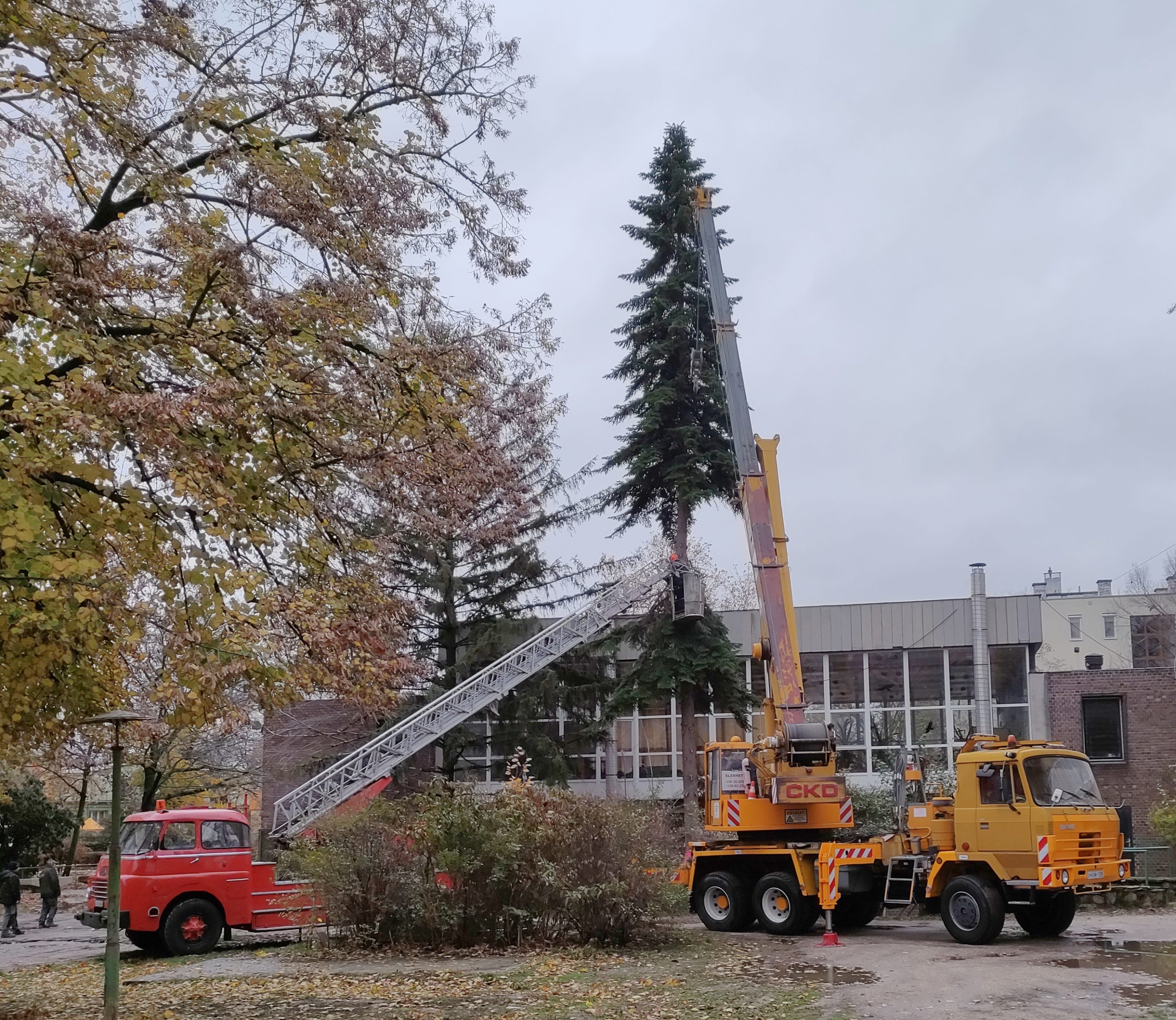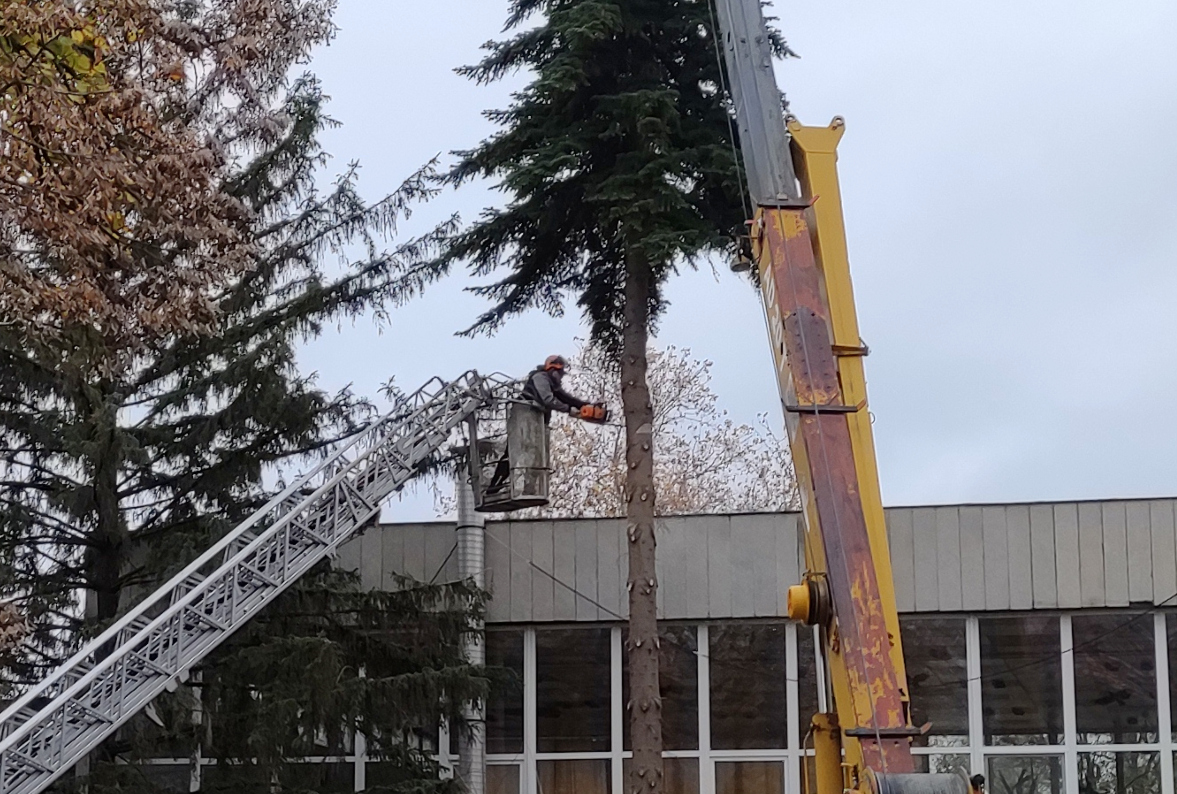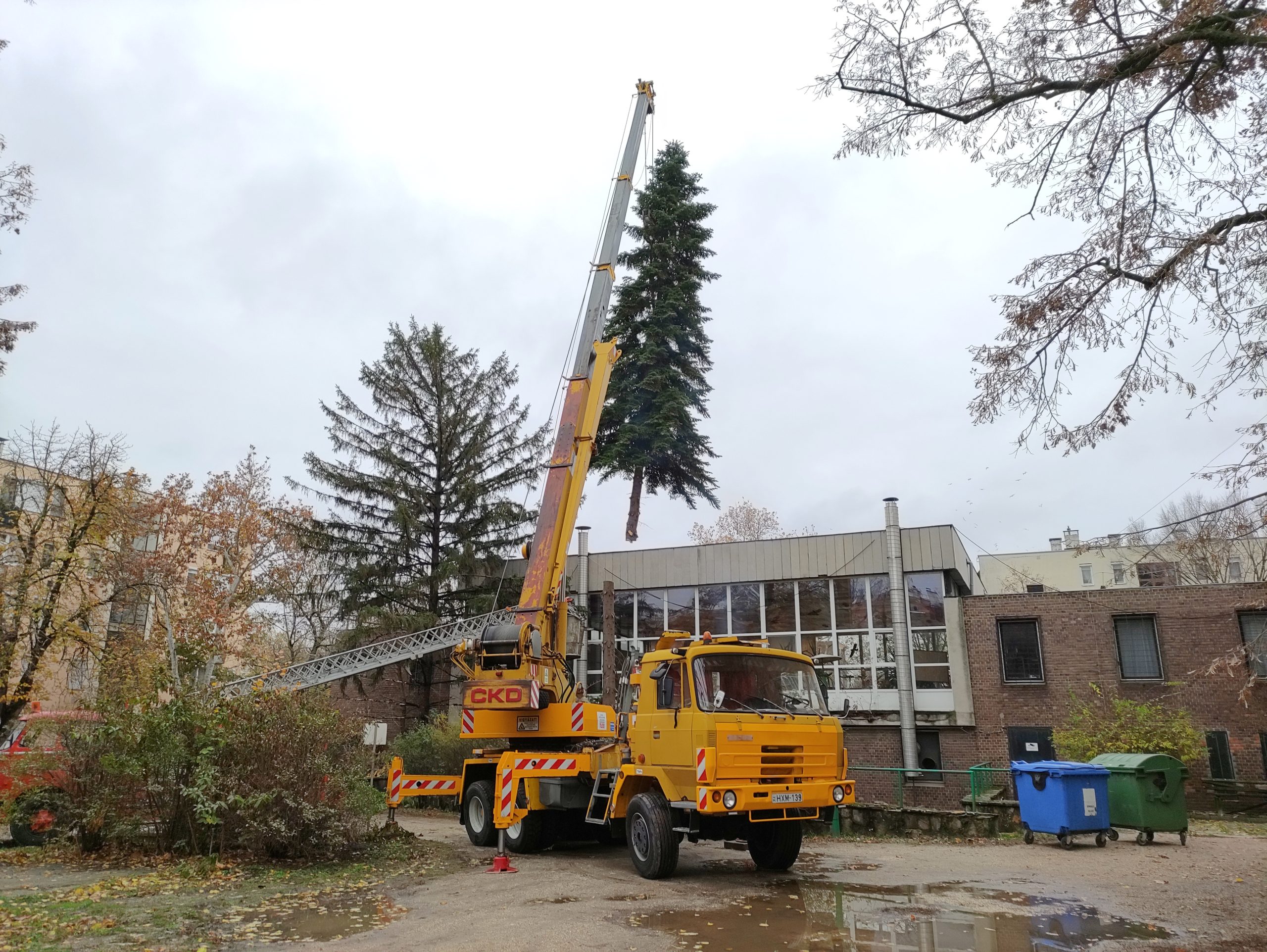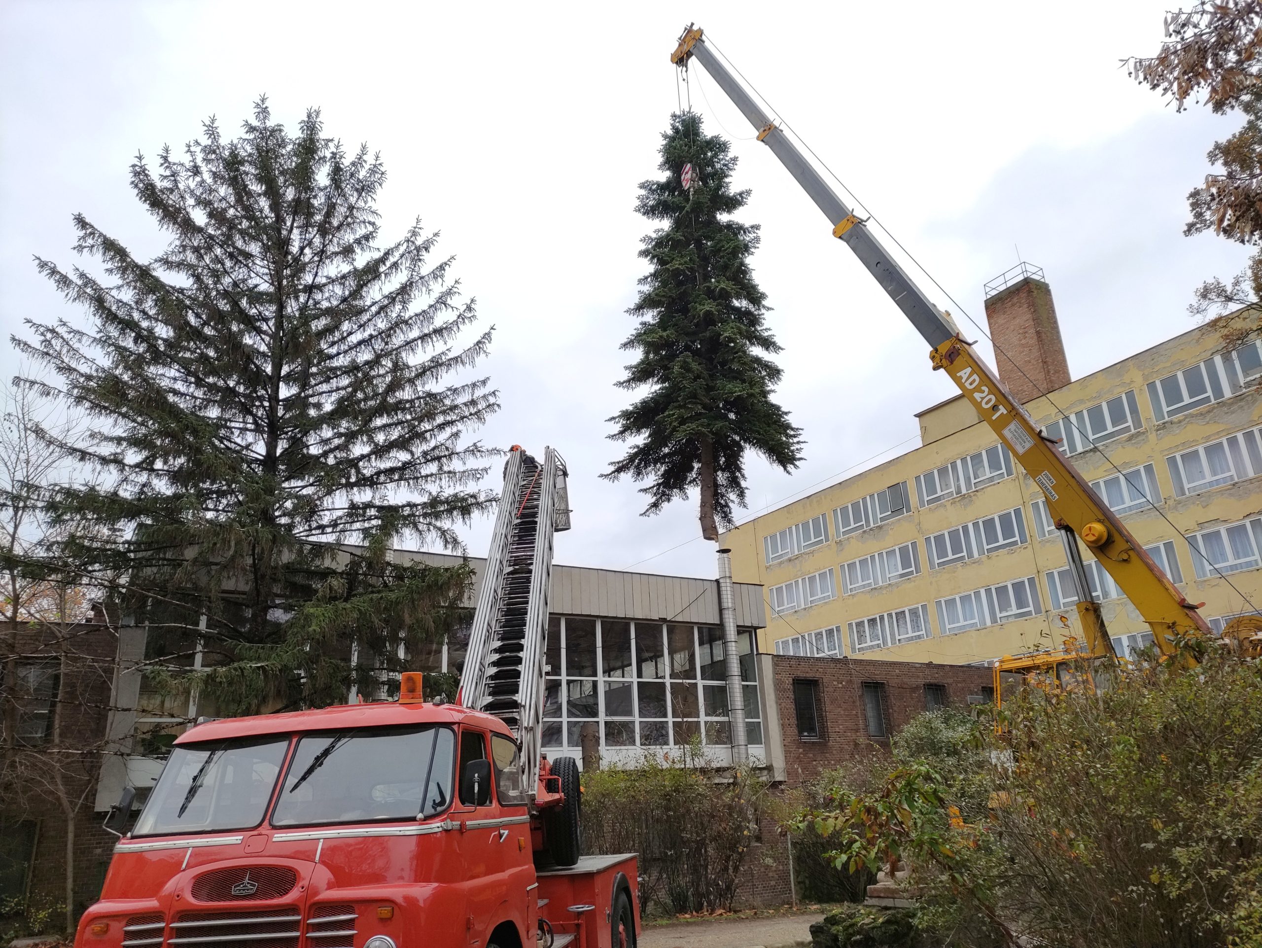 A Cseresnyés kollégium ebédlője mögötti egyik fenyőből lett a város idei karácsonyfája. A mintegy 20 méteres fát szombat kora reggel vágták ki, majd szállították át a Kossuth térre, ahol beemelték az óriás fenyőtalpba. A jövő hét elején fel is díszítik.
