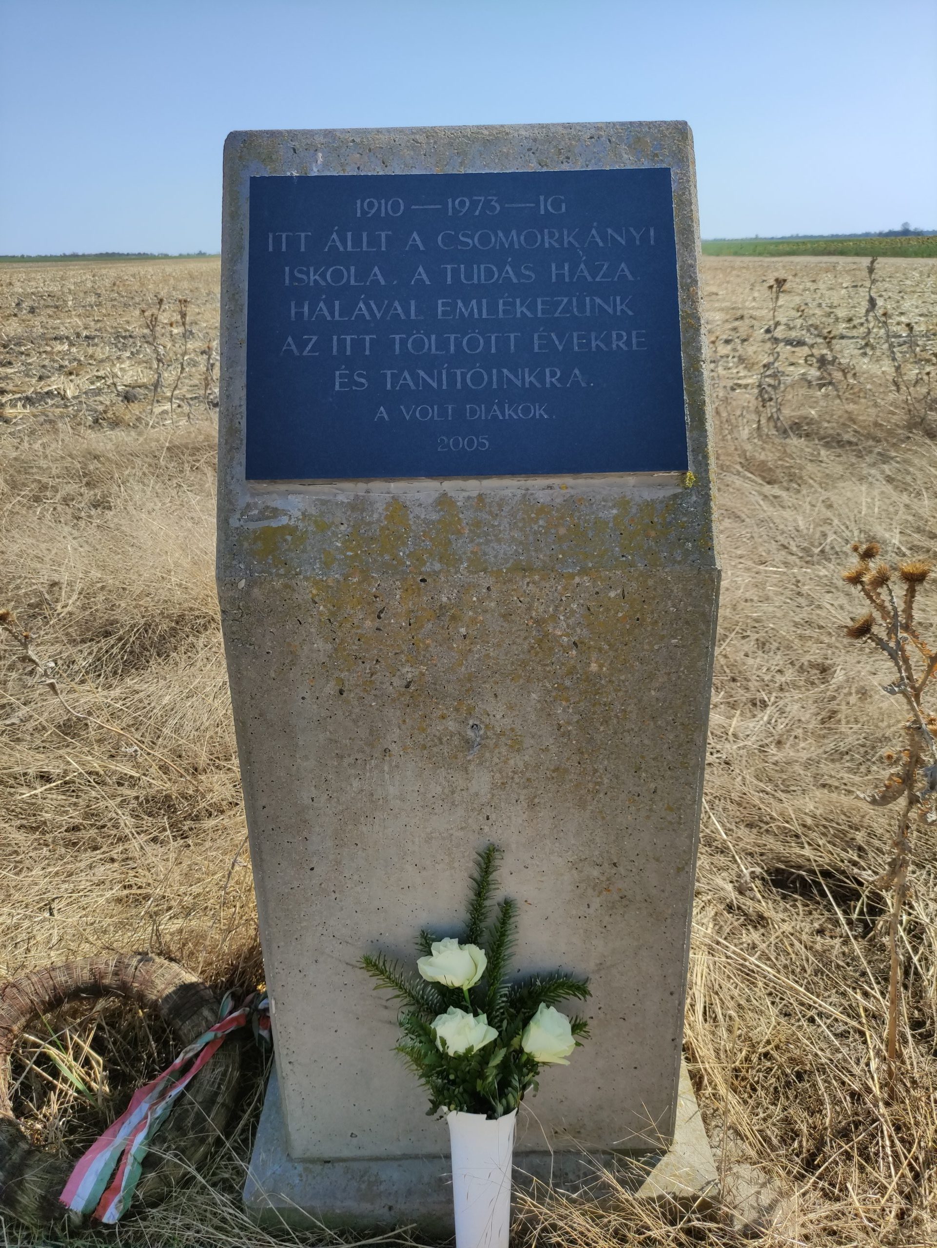 A csomorkányi iskola az 1906/1907. tanévben nyílt meg egy erre a célra bérelt tanyaépületben. A tégla iskolaépület 1910-ben épült fel a középkori templomrommal szemben, és állt ott egészen addig, míg 1973-ban le nem bontották. A helyén ma emléktábla áll, amelyhez az emlékezők csoportja a nagy forróság miatt most nem zarándokolt el, de amelynél virág és koszorú is tanúsítja, hogy nem felejtették el múltjuk ezen részét.