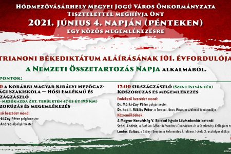 Trianoni megemlékezést tart Hódmezővásárhely önkormányzata június 4-én, pénteken, 16:30-tól a Hősi emlékműnél valamint 17:00-tól a Szent István téren.