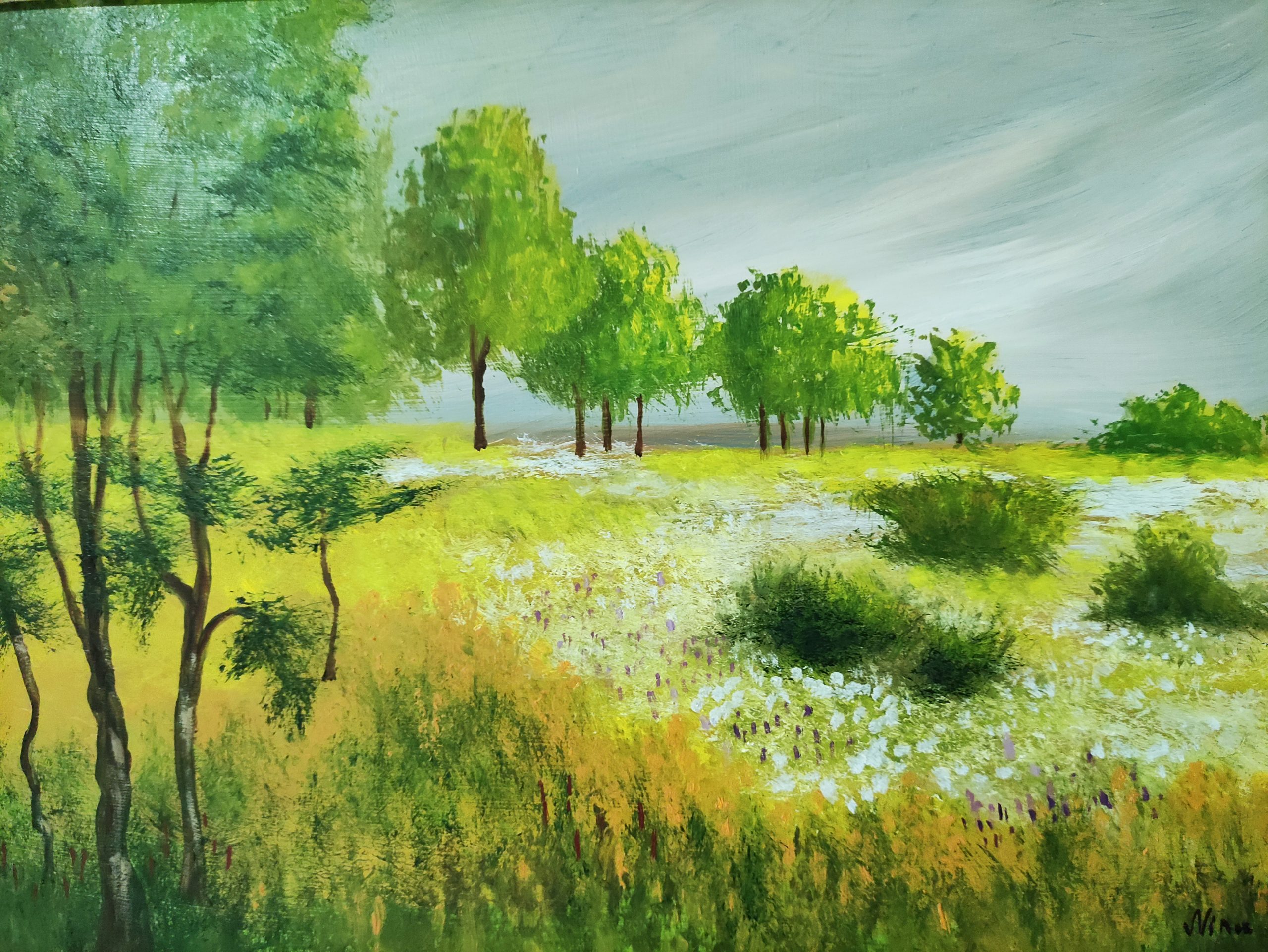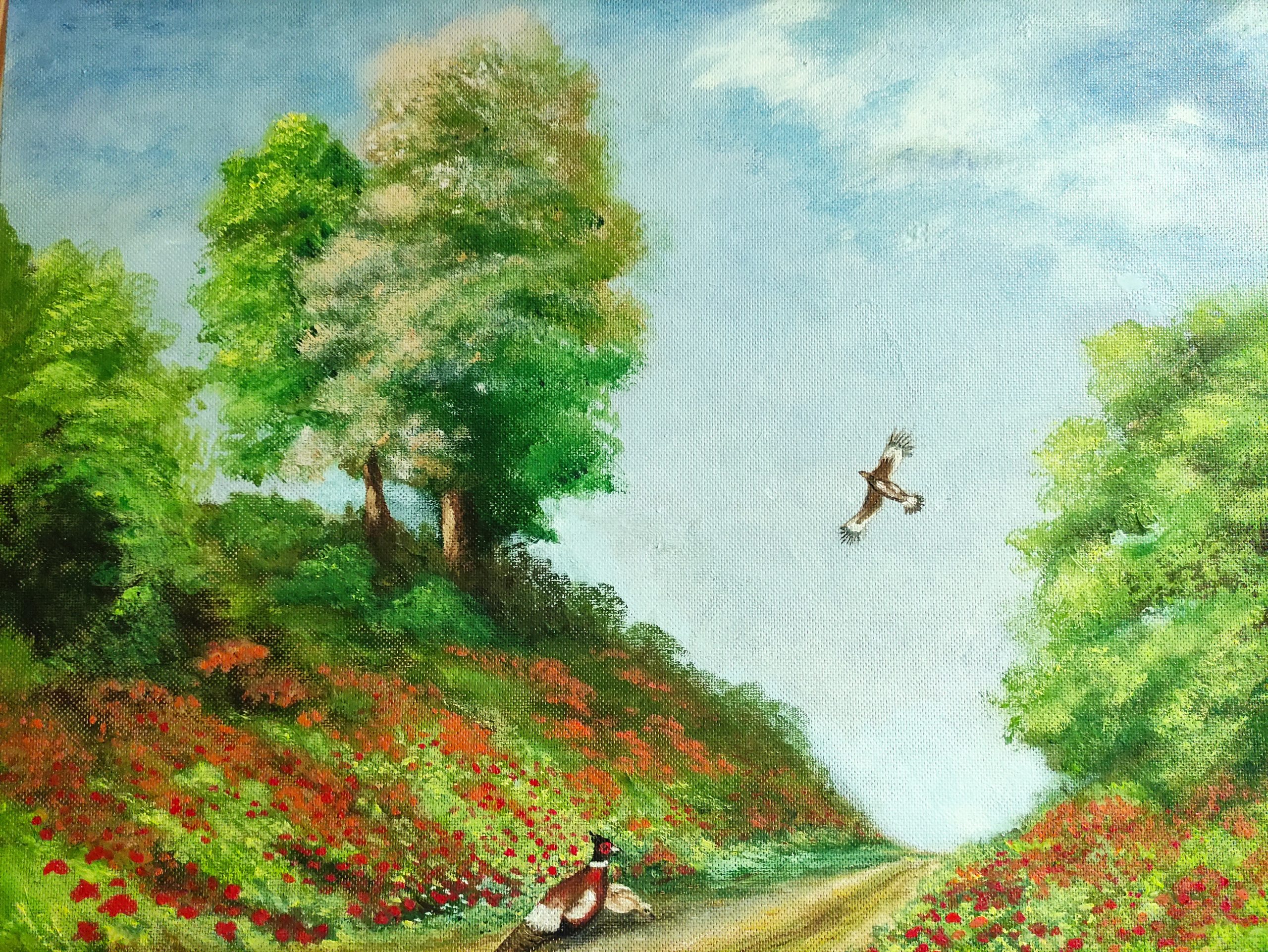 Hamari Jánosné egyszerű szempontok alapján választja meg témáit, azt festi meg, ami neki tetszik. – Főleg a fák, a virágok, a madarak és az élővilág vonz, embert még nem nagyon ábrázoltam, csak hátulról festettem. Az egyik ilyen a képemen egy juhász tereli a juhokat, a másikon pedig egy pecázó látható. De portréval még nem foglalkoztam.