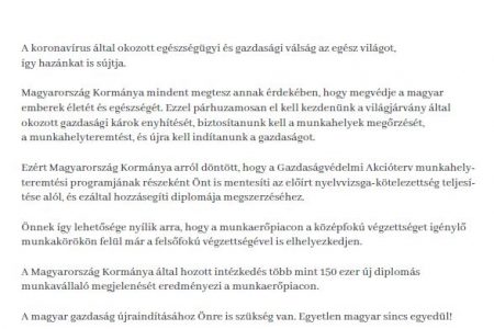 „A magyar gazdaság újraindításához Önre is szükség van” – ezt írja Orbán Viktor miniszterelnök abban a levélben, amelyet a közösségi médiában egy korábbi ellenzéki kerekasztal szervezői osztottak meg, és amelyet információjuk szerint az idén kiadott diplomákba tesznek bele betétlapként. Az nem világos, hogy ezt az is megkapja-e, akinek már megvan a nyelvvizsgája, csak éppen idén diplomázik.