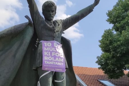 Tíz év múlva ki fog rólam tanítani? – teszi fel a kérdést az a lila színű plakát, melyet a hét végén kötöttek fel a vásárhelyi Petőfi-szobor mellkasára.