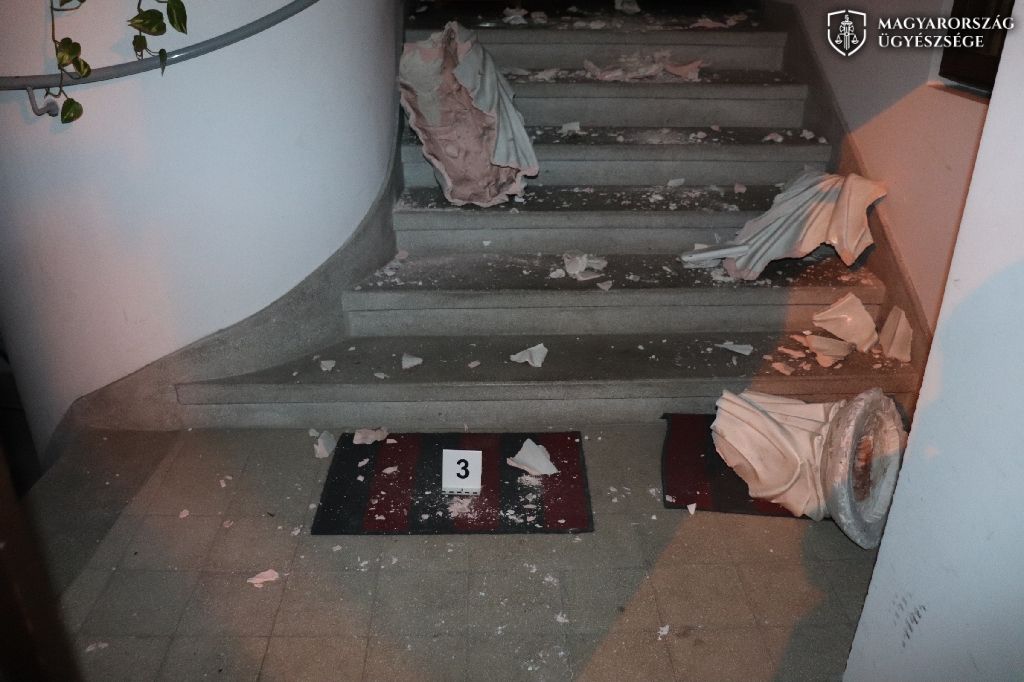 A rendőrség által a bűnügyi helyszínelés során készített fotókon a plébánia ajtaja, illetve a széttört szobornak a plébánia lépcsőjén maradt maradványai láthatók.