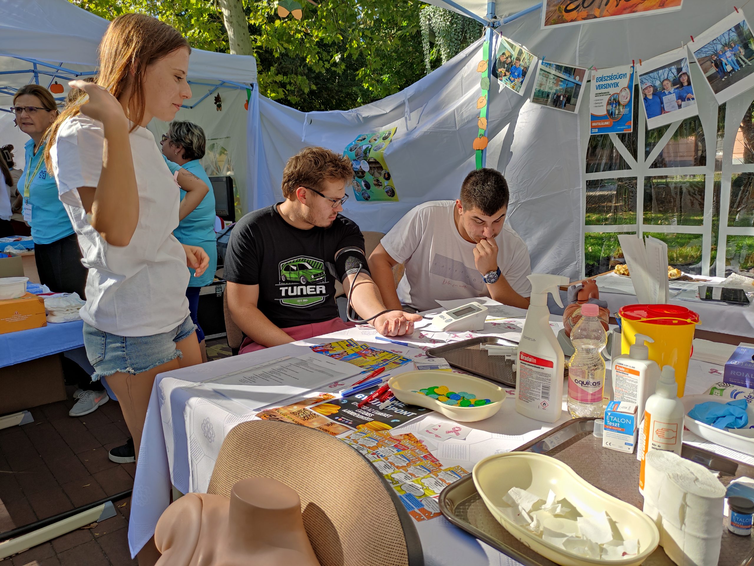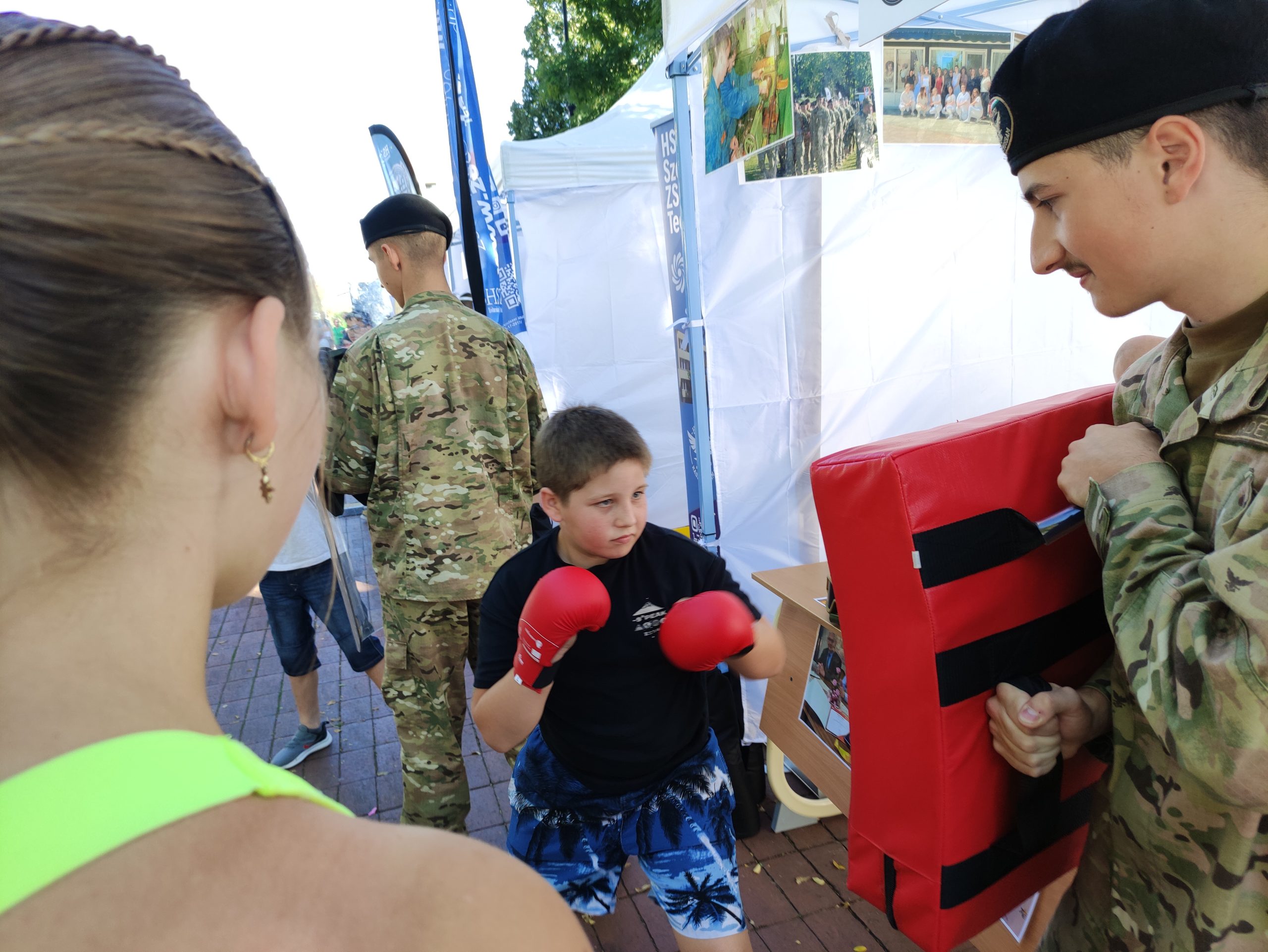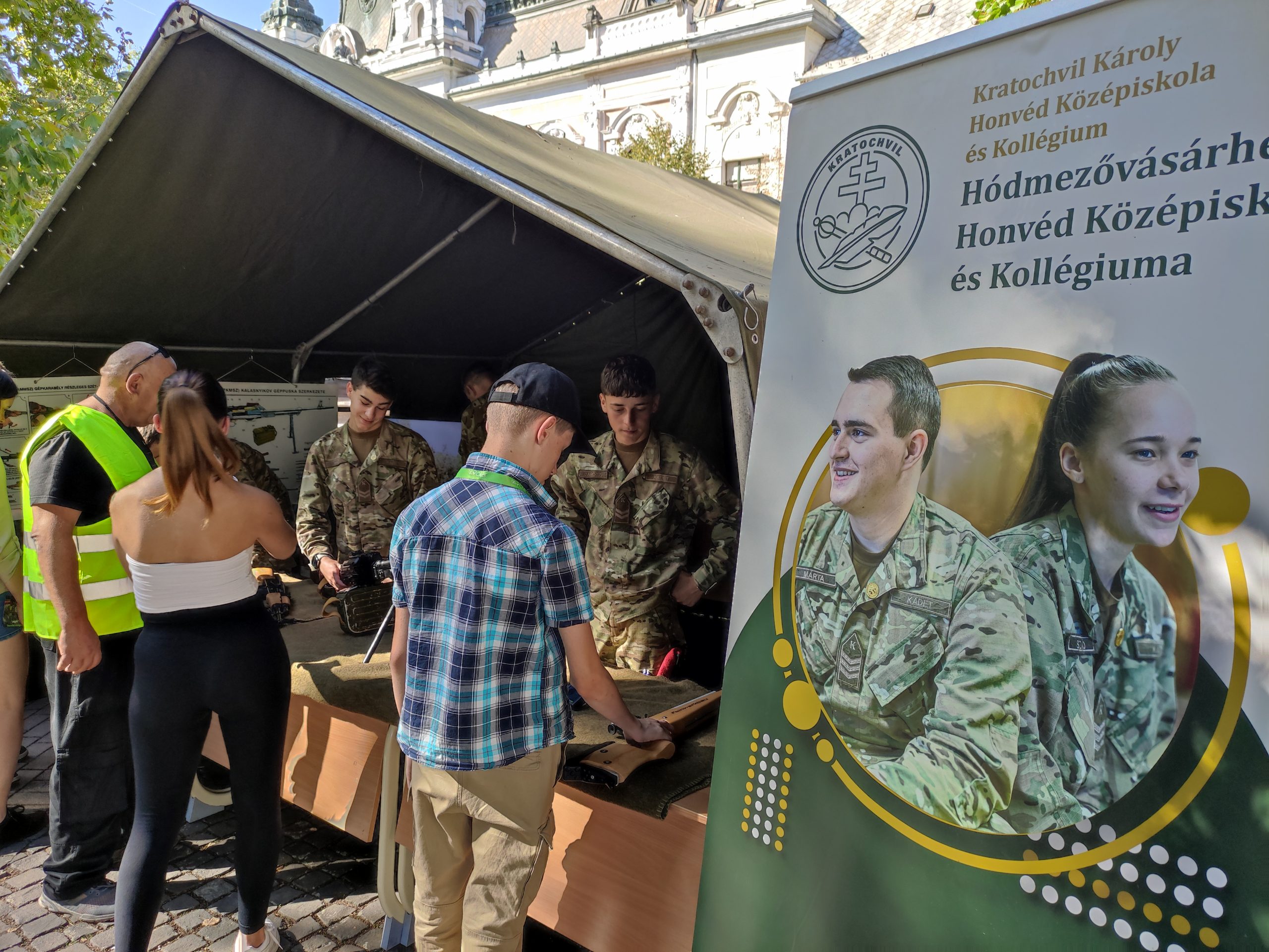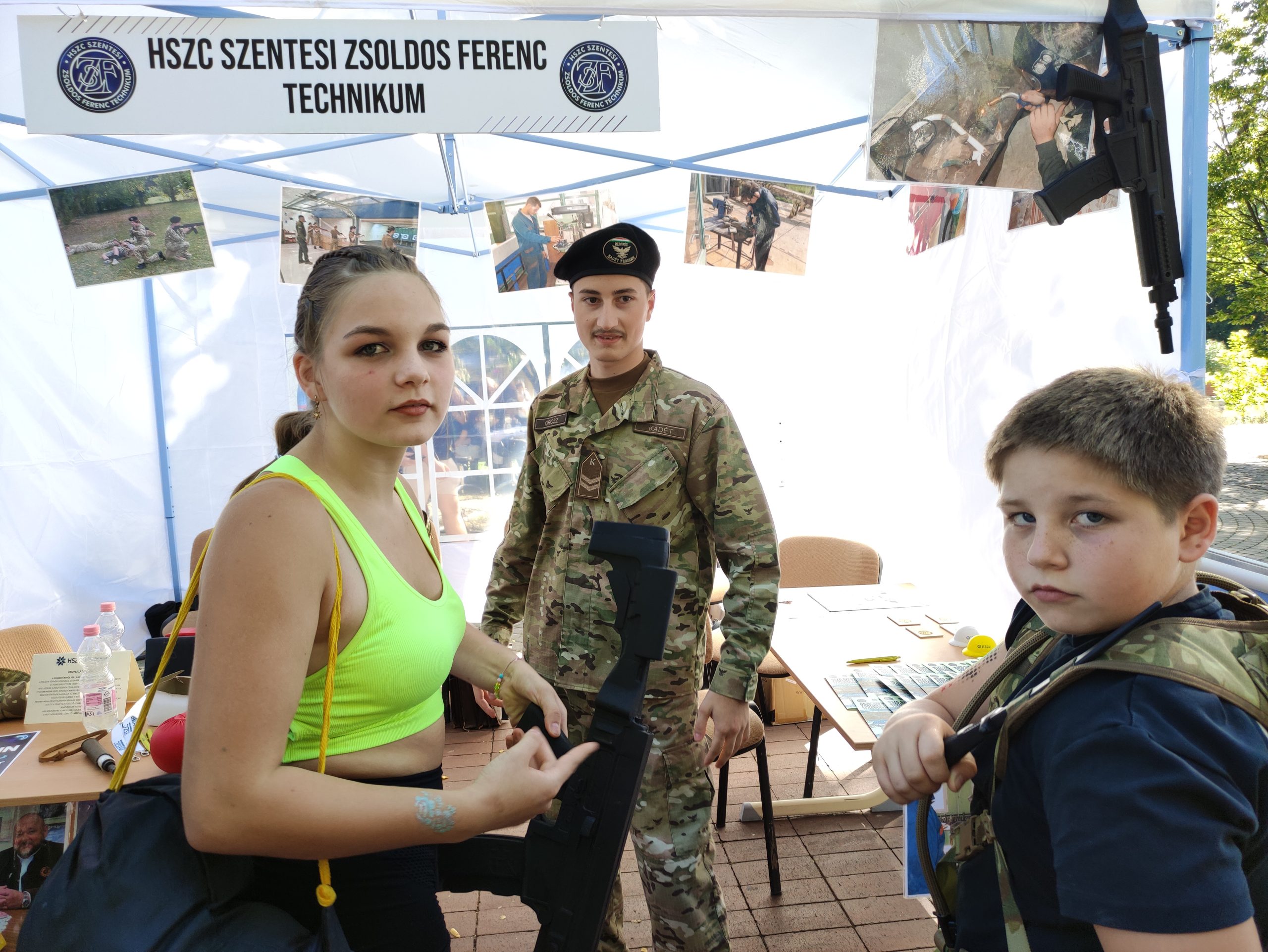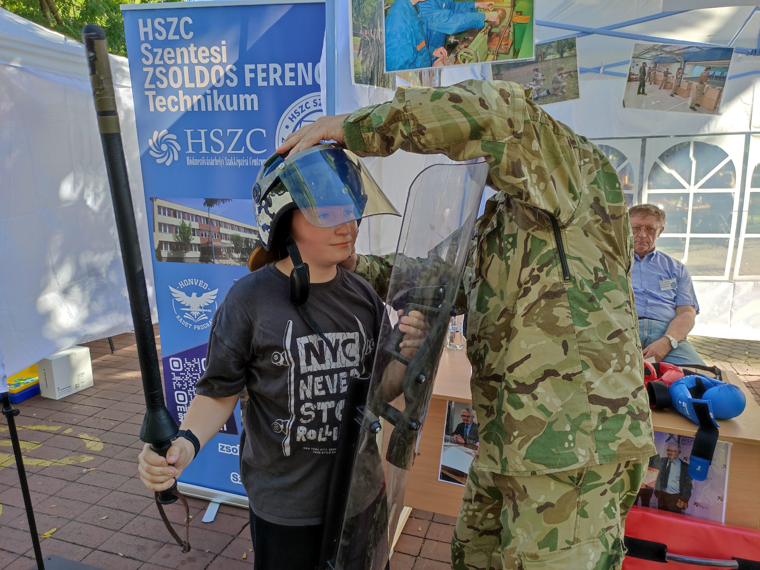 A fiúkat – és meglepően sok lányt – a honvéd kadétképzés sátra vonzotta talán a leginkább. Akik beleélték magukat a katonaéletbe, a tér másik részén a szentesi Zsoldos sátránál kétféle sisakot is felpróbálhattak, kezükbe vehettek gumibotot és plexipajzsot is. Aztán az egyik katona fogta kézbe a pajzsot, a fiúk pedig gumibottal tesztelték, valóban törhetetlen-e. (Az volt!)