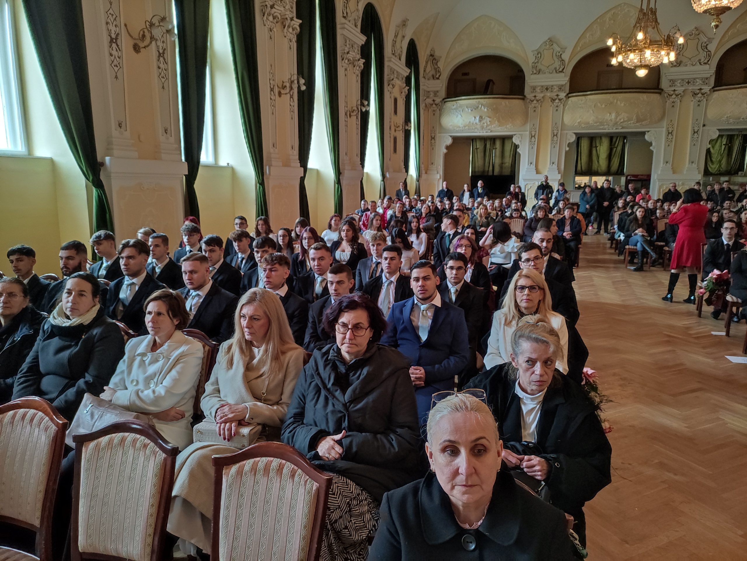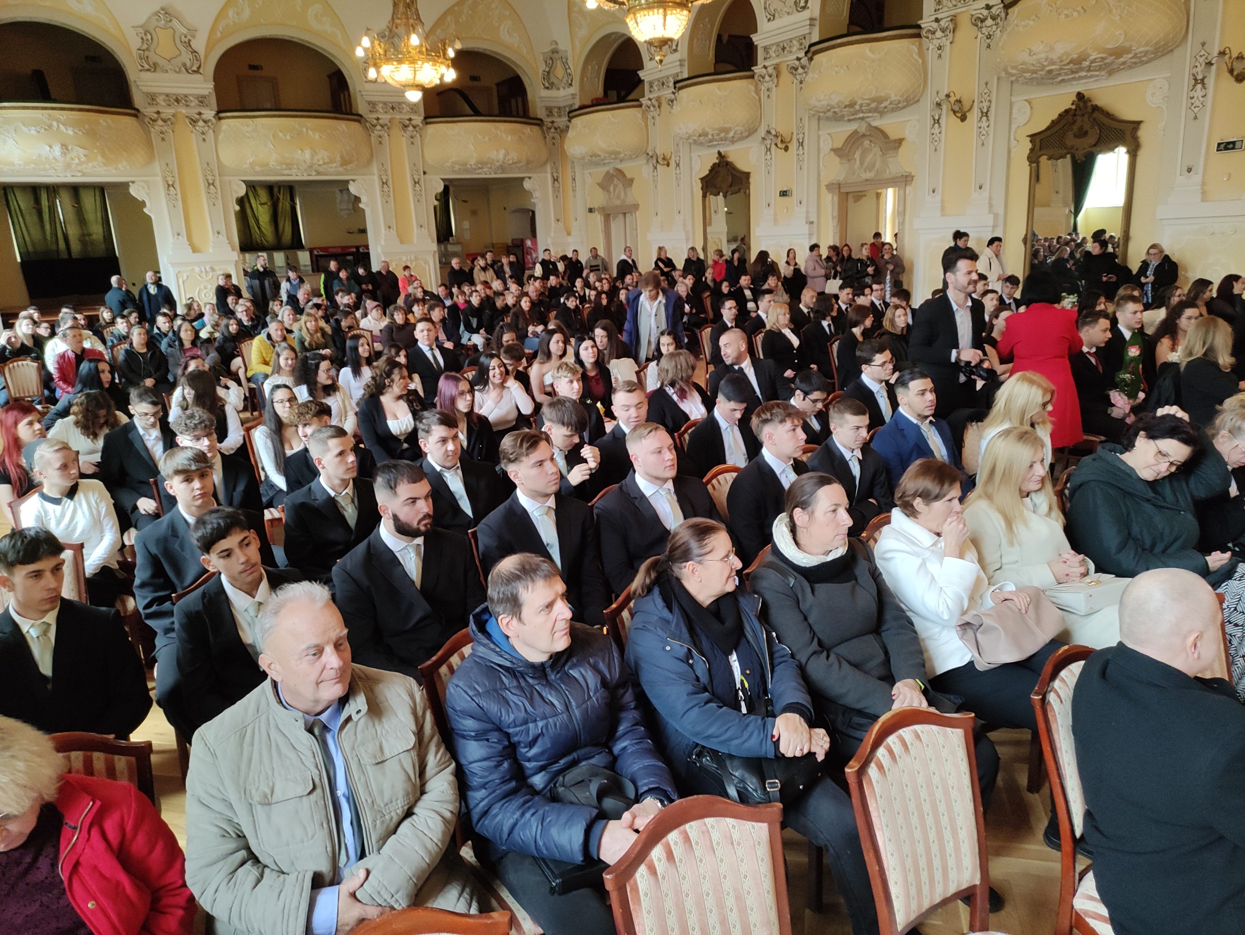Az 5 végzős osztály 84 diákja szalagját tűzték fel ma délután a Fekete Sas báltermében rendezett ünnepségen osztályfőnökeik.