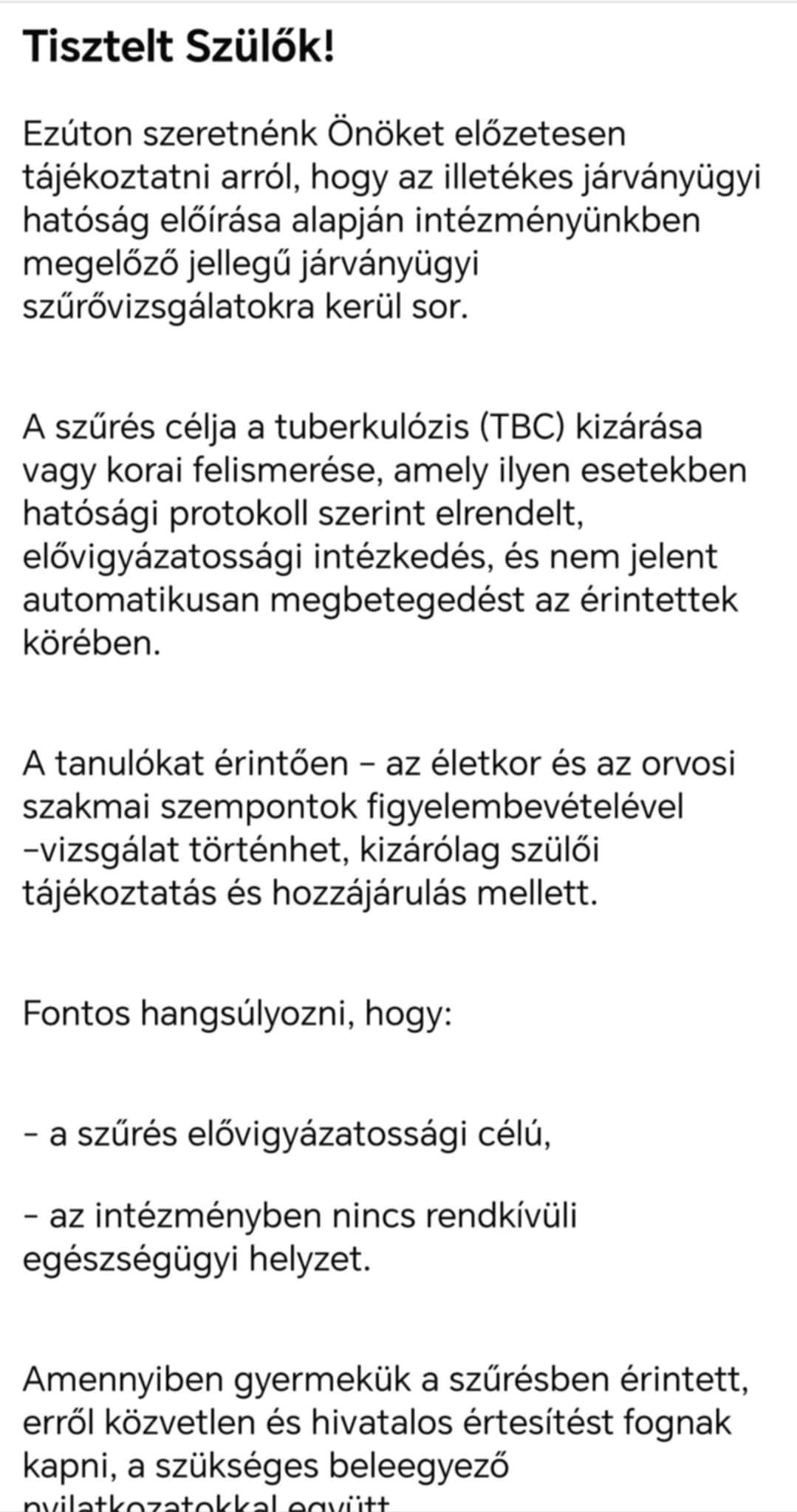 A két közlés időrendje alapján tehát a szűrővizsgálatok előkészítése és megkezdése megelőzte a TBC-megbetegedés hivatalos nyilvánosságra hozatalát. A tankerületi közlemény nem tér ki arra, hogy a szülők pénteki értesítésekor már ismert volt-e az igazolt megbetegedés, illetve arra sem, hogy pontosan mikor vált véglegessé a diagnózis.