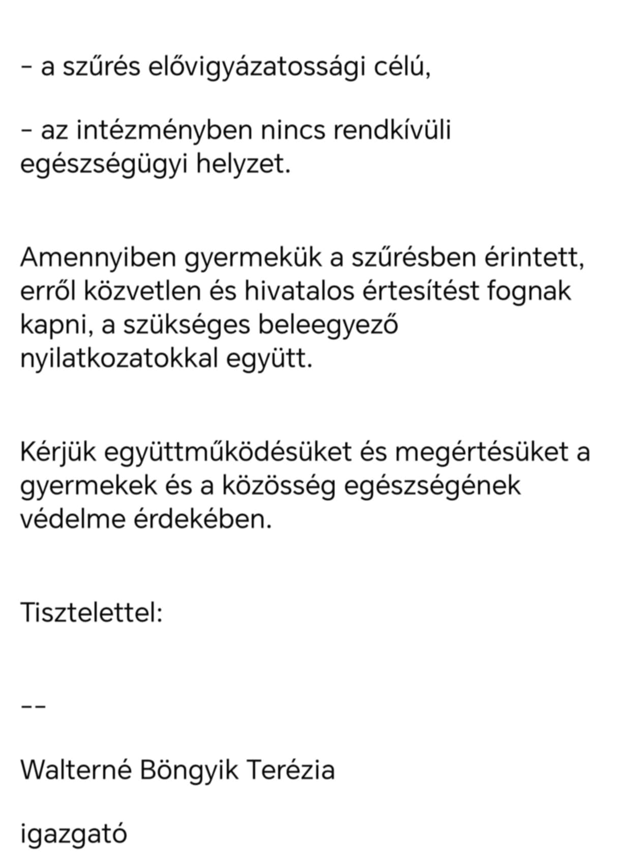 Az iskola igazgatója, Walterné Böngyik Terézia levelében akkor még kizárólag „megelőző jellegű”, „elővigyázatossági célú” intézkedésként írt a szűrésekről.