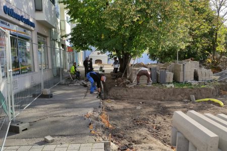 A járdaépítés párhuzamosan zajlik a Kossuth tér dél-délkeleti része, azaz az Ótemplom és a Sarokház közti szakasz rekonstrukciójával. Mint arról többször is beszámoltunk: még július 12-én kordonozták körbe a Kossuth tér Sarokház felőli részét, majd felverték a járdát. Elbontották a térrész szintkülönbségét elválasztó, még 1965-ből származó mellvédjét és az Ótemplom felől a sarokház felé vezető lépcsőt is, de elbontották a templomkertből a sarokház felé vezető lépcsőt is. Kivágták a rossz állapotban lévő, az Ótemplom bejárata felől álló fenyőket (egyet már korábban ki kellett, annak életveszélyes volta miatt). Majd az ótemplom körül emelt védfal megmaradt részének tetejéről távolították el az ott növögető facsemetéket, s magas nyomású vízzel lemosták a falat.