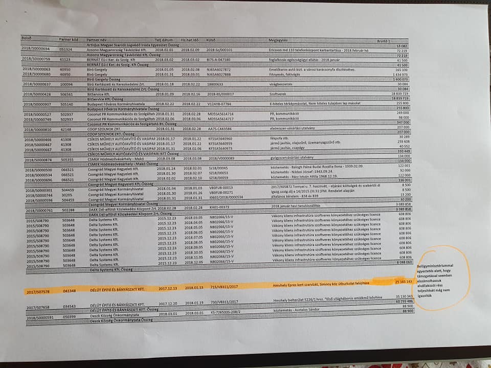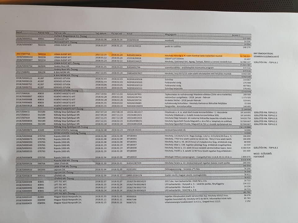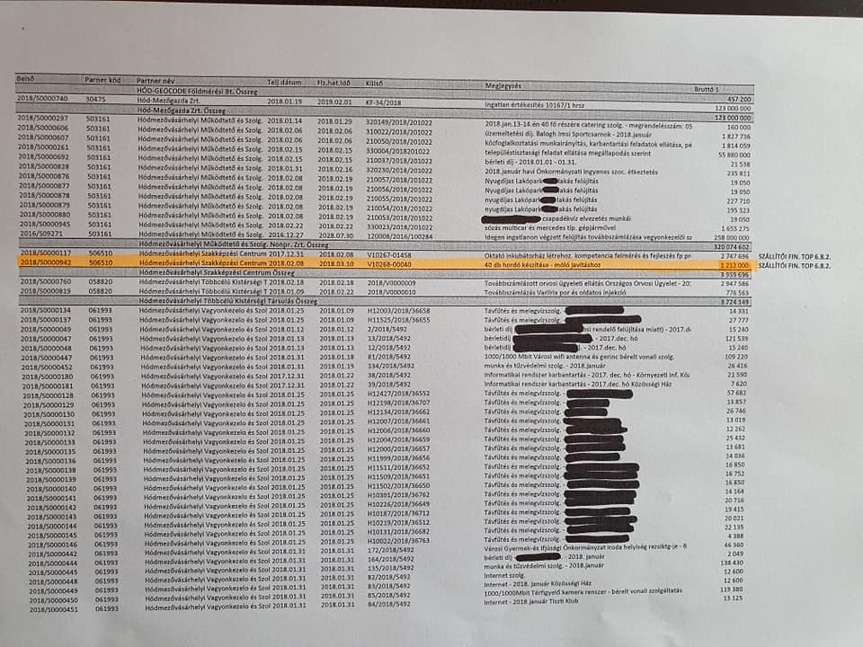 „Hegedűs Zoltán Facebook bejegyzéséből tudjuk, hogy véleménye szerint átadás-átvételkor 613 millió forint volt a kifizetésre váró számlák összege. Mellékelt fotókon narancssárgával kiemelve látható három olyan tétel, amit pályázati pénzből terveztek kifizetni, de végül ezt saját forrásból kellett. Így a teljes beszállítói állomány nem 613 millió, hanem 696 millió forint volt. Ez mára 370 millióra csökkent, amiből 140millió az önkormányzati cég felé teljesítendő, valamint a lejárt beszállítói tartozás jelenleg mindösszesen 188 millió forintot tesz ki. Ez azt jelenti, hogy a jelenlegi városvezetés 326 millió forinttal csökkentette ezt a tételt.Volt időszak a város korábbi életében, amikor ez 1-1,5 milliárd forint között mozgott.”