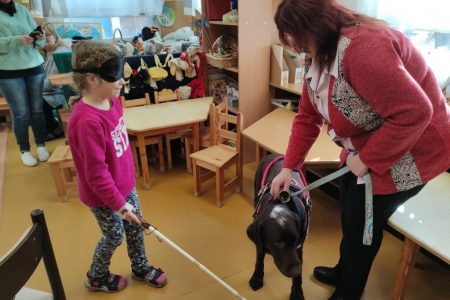 Azt is kipróbálhatták az érzékenyítő foglalkozáson, hogy megtalálják-e a fülük és egy fehér bot segítségével Bodzát, a vakvezető kutyát.