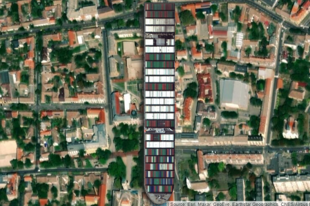 Szerencse, hogy nem a Dr. Rapcsák András úthoz és a Kossuth térre szorult be a konténerhajó. Egy térképes alkalmazással bárhova odaszerkeszthetjük a hajót, amit egyébként ma tudtak kiszabadítani a szuezi csatornánál.