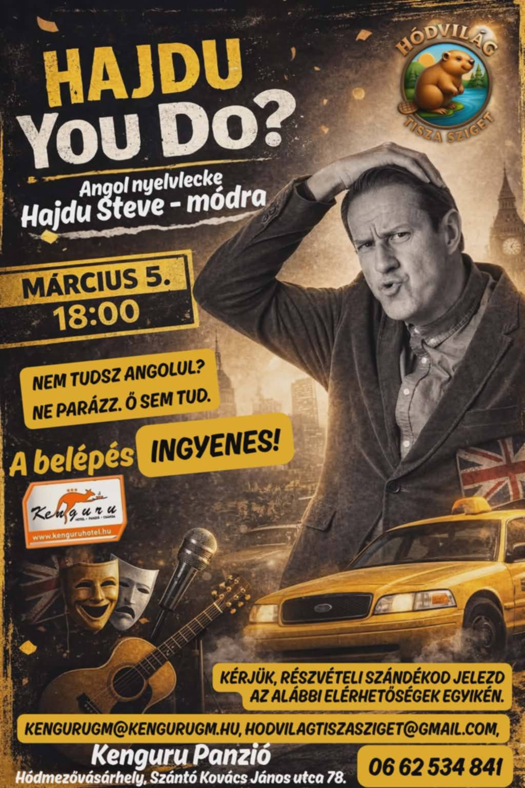 Különleges, humorral fűszerezett estére várják az érdeklődőket március 5-én, csütörtökön 18 órától a Kenguru Panzióban, ahol Hajdu Steve hozza el sajátos „angol nyelvleckéjét”. A programot a Hódvilág Tisza Sziget szervezi, akik ezúttal egy könnyed, közösségi élményt kínálnak a város lakóinak.
