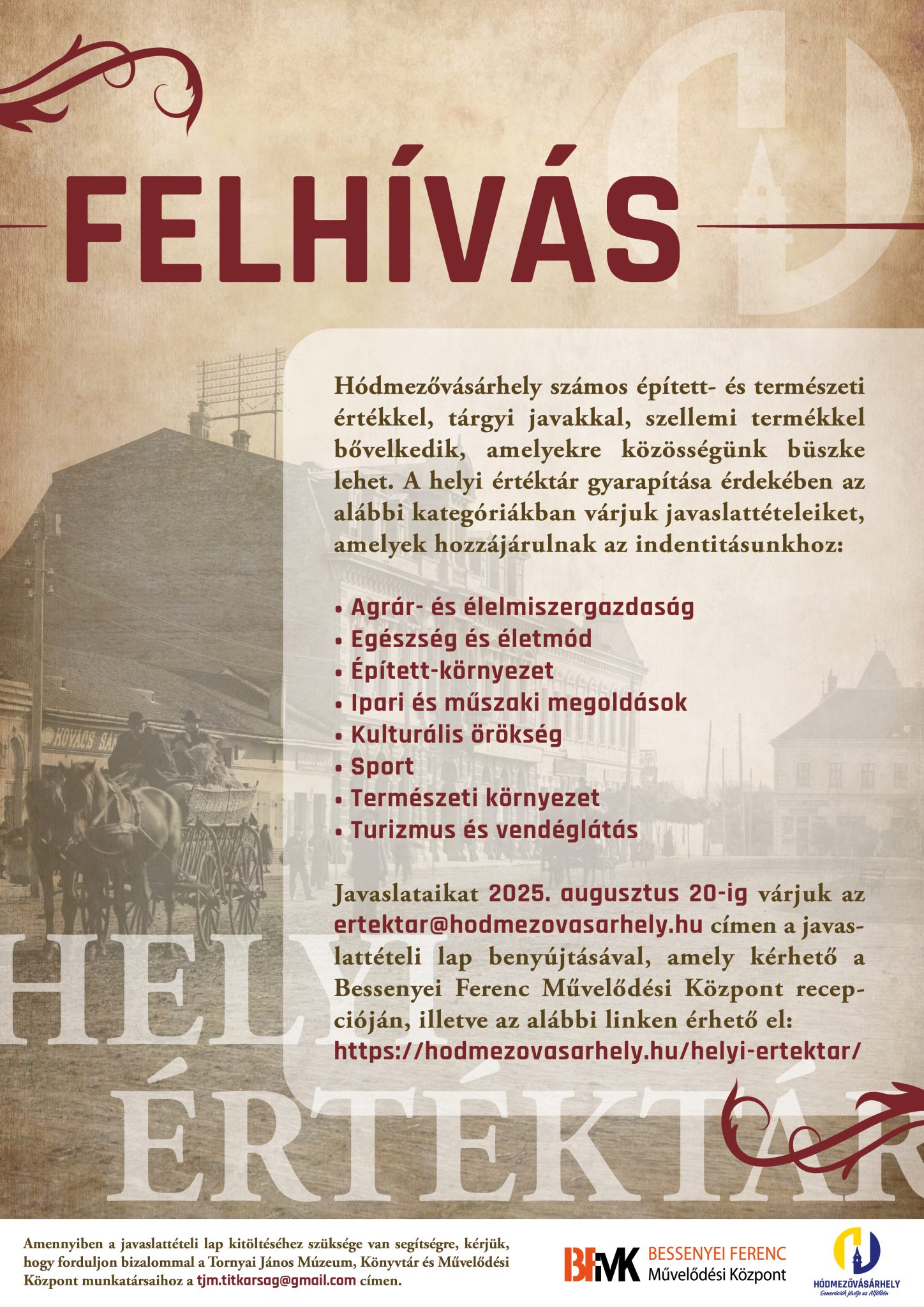 A javasolt tételeket augusztus 20-ig küldhetik el az ertektar@hodmezovasarhely.hu email-címre, azon a formanyomtatványon, amelyet innen is letölthetnek, illetve a BFMK recepcióján is megtalálhatják.