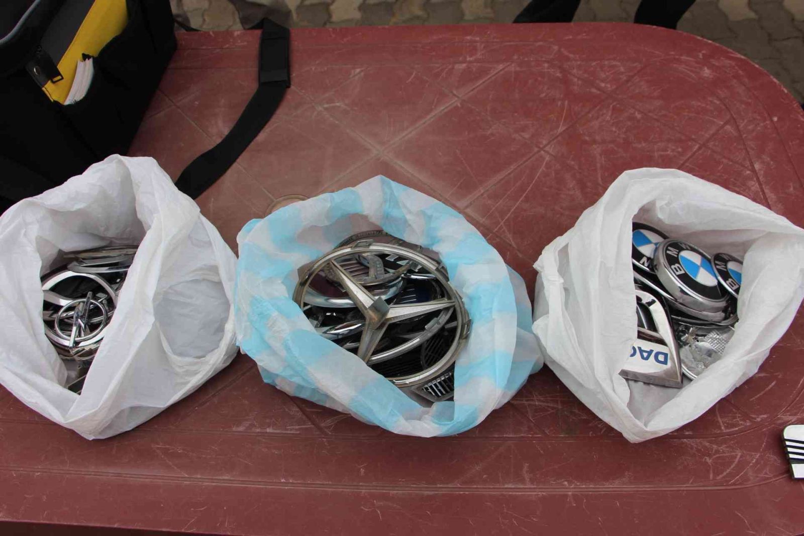 Fázisceruzával feszegette le azokat, egyenesen a járművekről. A rendőrség fotóján a lefeszegetett autóemblémák.