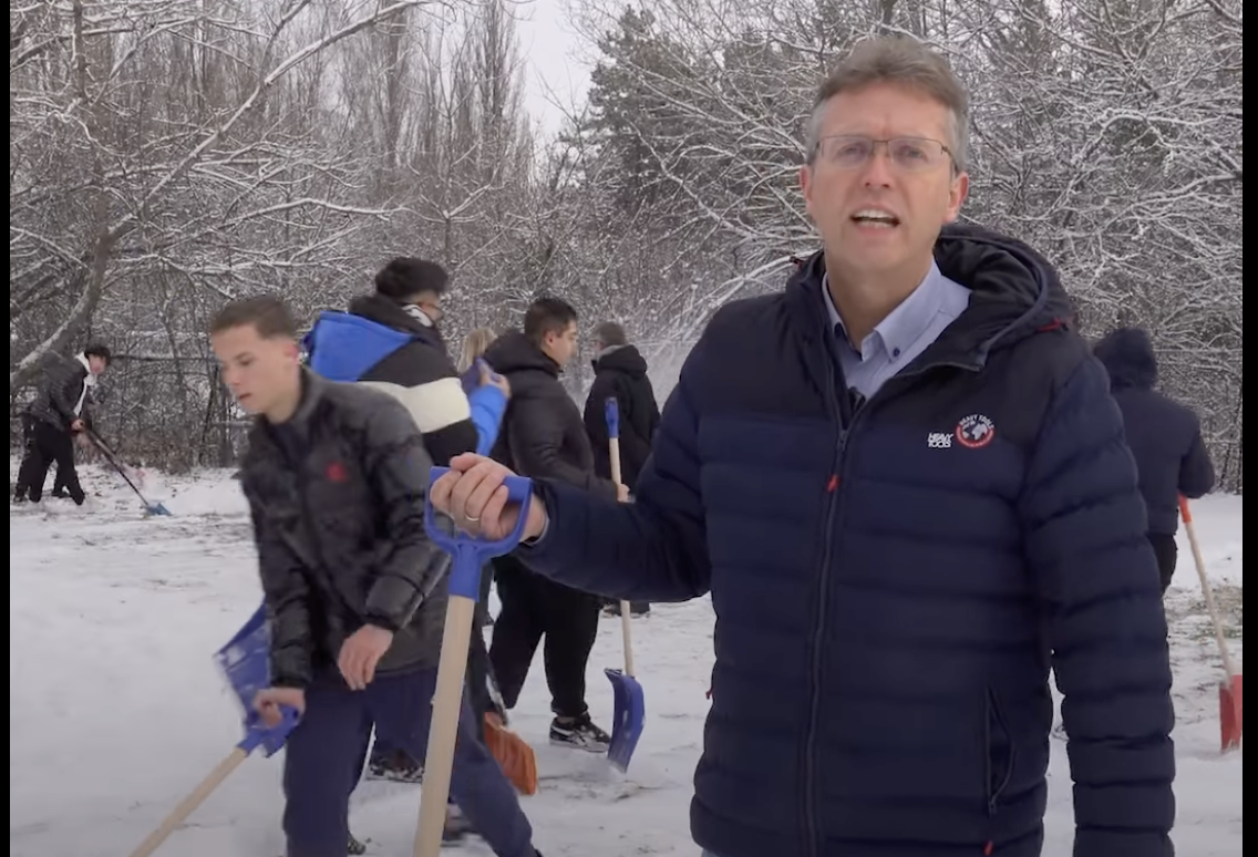 „Kaptak egy levelet tőlem, amiben arra kérem, hogy a stramm diákok – akik itt is vannak – segítsenek a hó eltakarításban, járdák, utak, közterek” – magyarázza hólapáttal a kezében a kultúráért és innovációért felelős miniszter, az egyetemistákkal kiabáló Hankó Balázs a Facebook-oldalára feltöltött videóban. Mindeközben a gödöllői Madách szakképző iskola diákjai szorgosan lapátolnak körülötte.