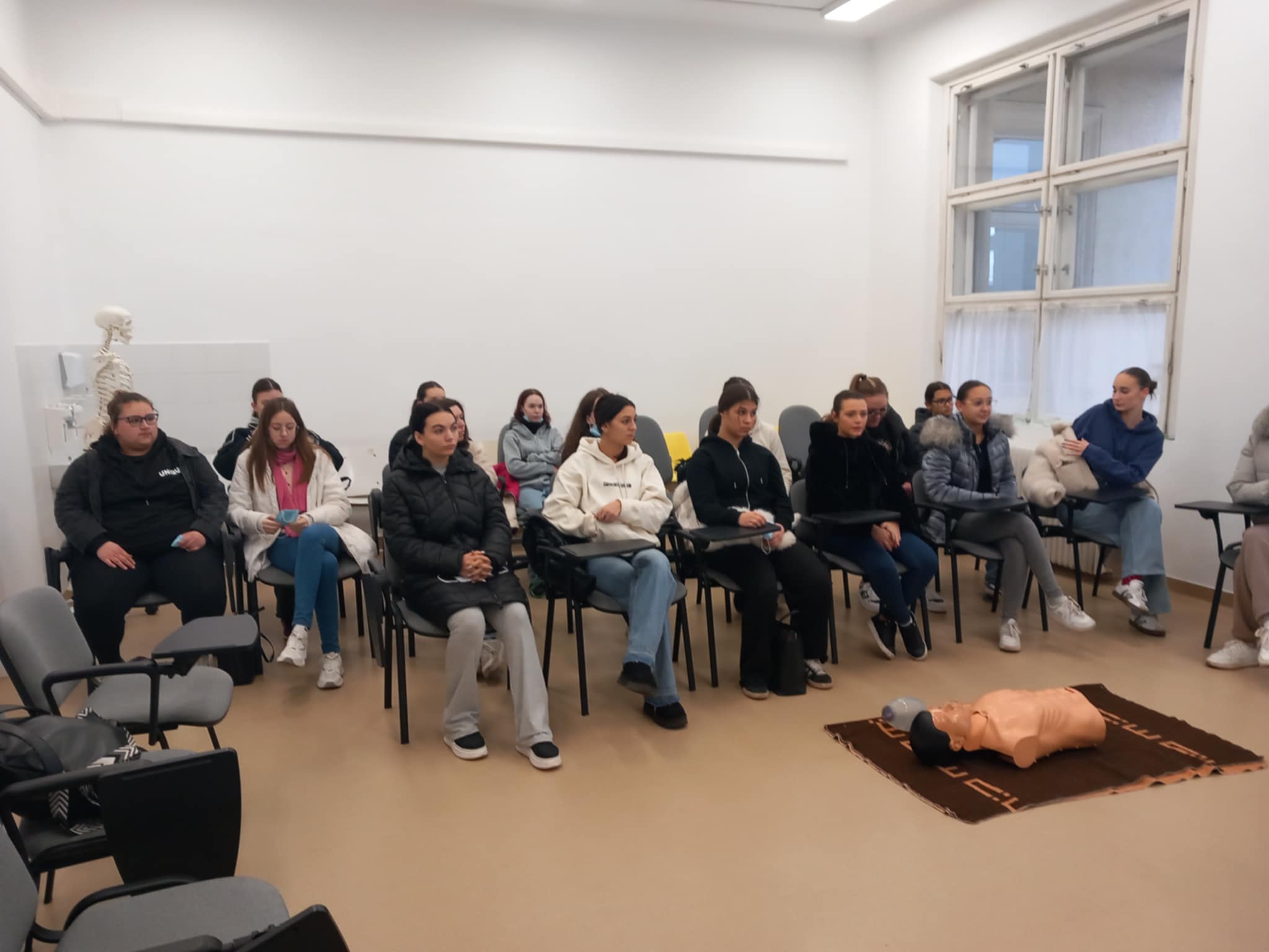 A program a Skill előadóteremben folytatódott, ahol elsőként a higiénés kézfertőtlenítés fontosságáról vetítettek le egy rendkívül informatív videót. Az előadás rávilágított arra, hogy a helyes és alapos kézfertőtlenítés napi szinten kulcsszerepet játszik a fertőzések és továbbfertőzések megelőzésében. Ezt a vitális paraméterek átbeszélése követte, majd egy BLS-bemutató során a tanulók megismerkedhettek a lélegeztető ballon működésével is.