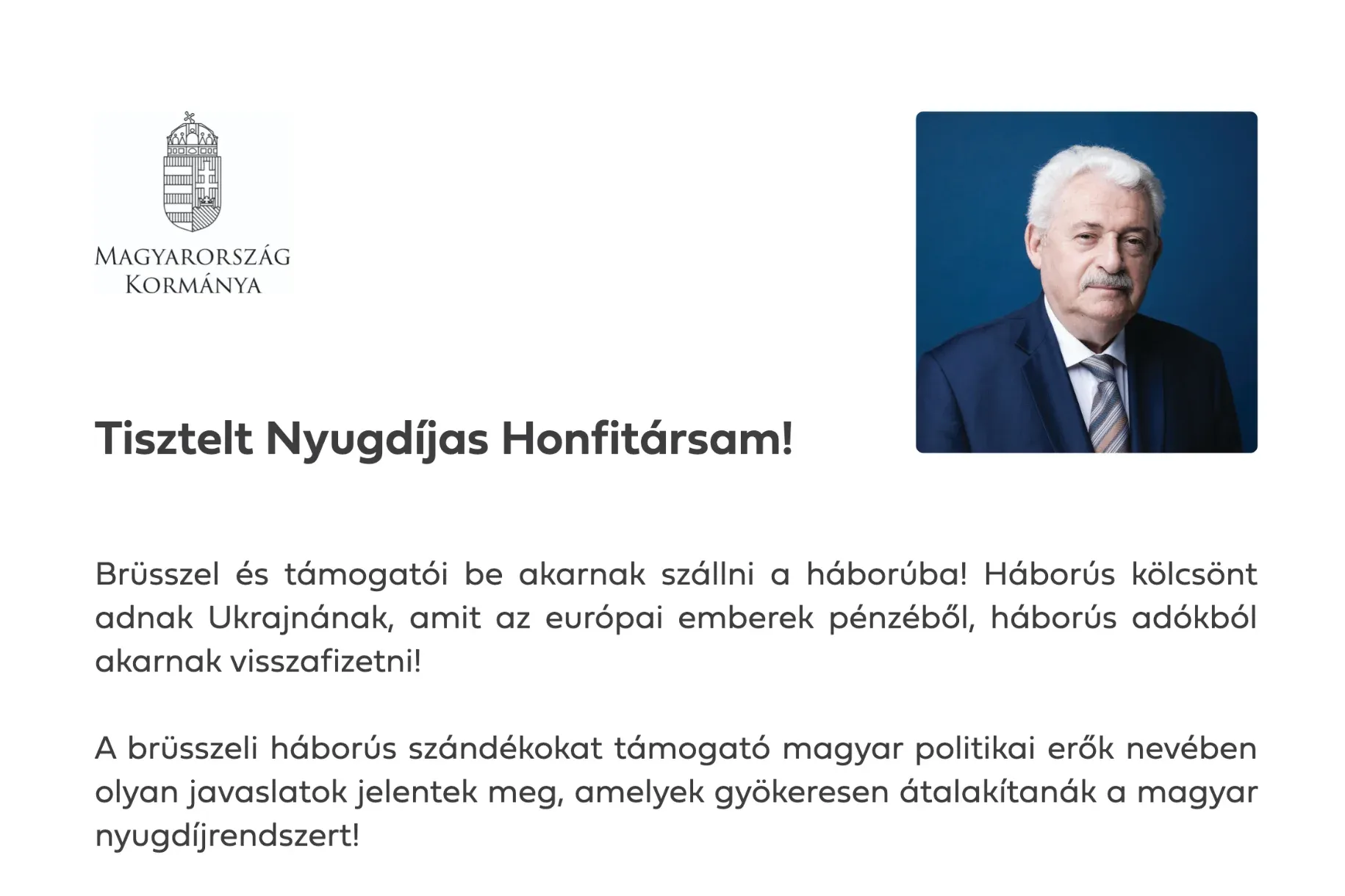 „Tisztelt Nyugdíjas Honfitársam! Brüsszel és támogatói be akarnak szállni a háborúba!” – így kezdődik az a propagandaüzenet, amit a kormány a nyugdíjas állampolgárok ügyfélkapus tárhelyére küldött ki, számolt be hétfőn a Telex.