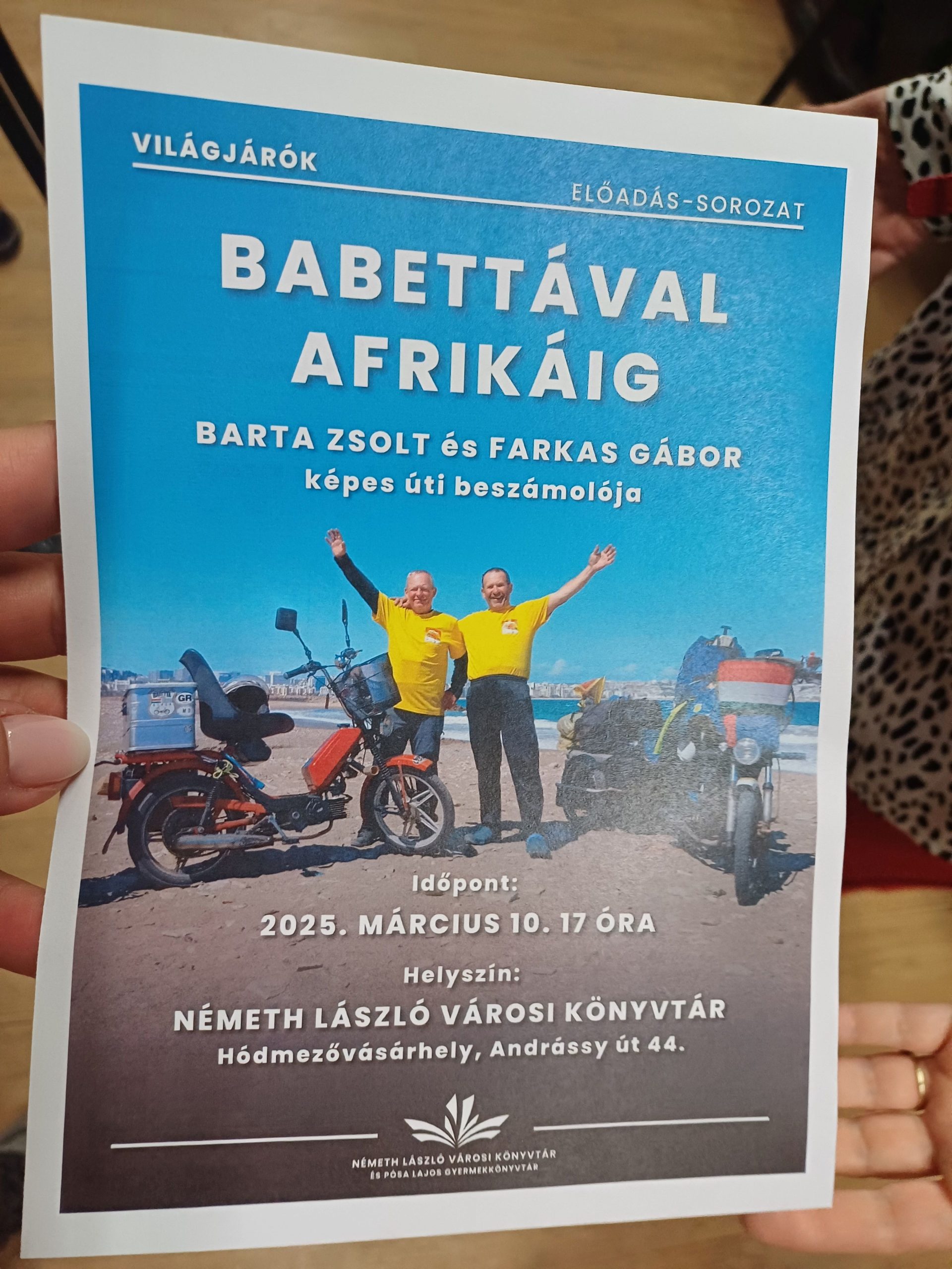 Egy vásárhelyi és szatymazi motoros tartott élménybeszámolót a könyvtárban, ahol arról meséltek, hogy hogyan indultak el kismotorral Afrikába. Számos kaland és kihívás elé néztek, miközben lenyűgöző tájakon motoroztak. Az előadás teltházas volt, hiszen mindenkit nagyon érdekelt a különleges utazás.