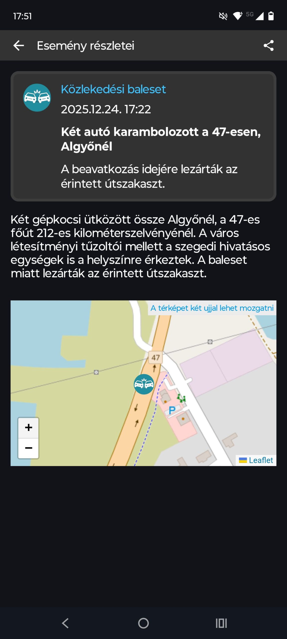 Két gépkocsi ütközött Algyőnél, a 47-es főút 212-es kilométerszelvényénél. Az érintett útszakaszt lezárták, az algyői és a szegedi egységek kivonultak a helyszínre.