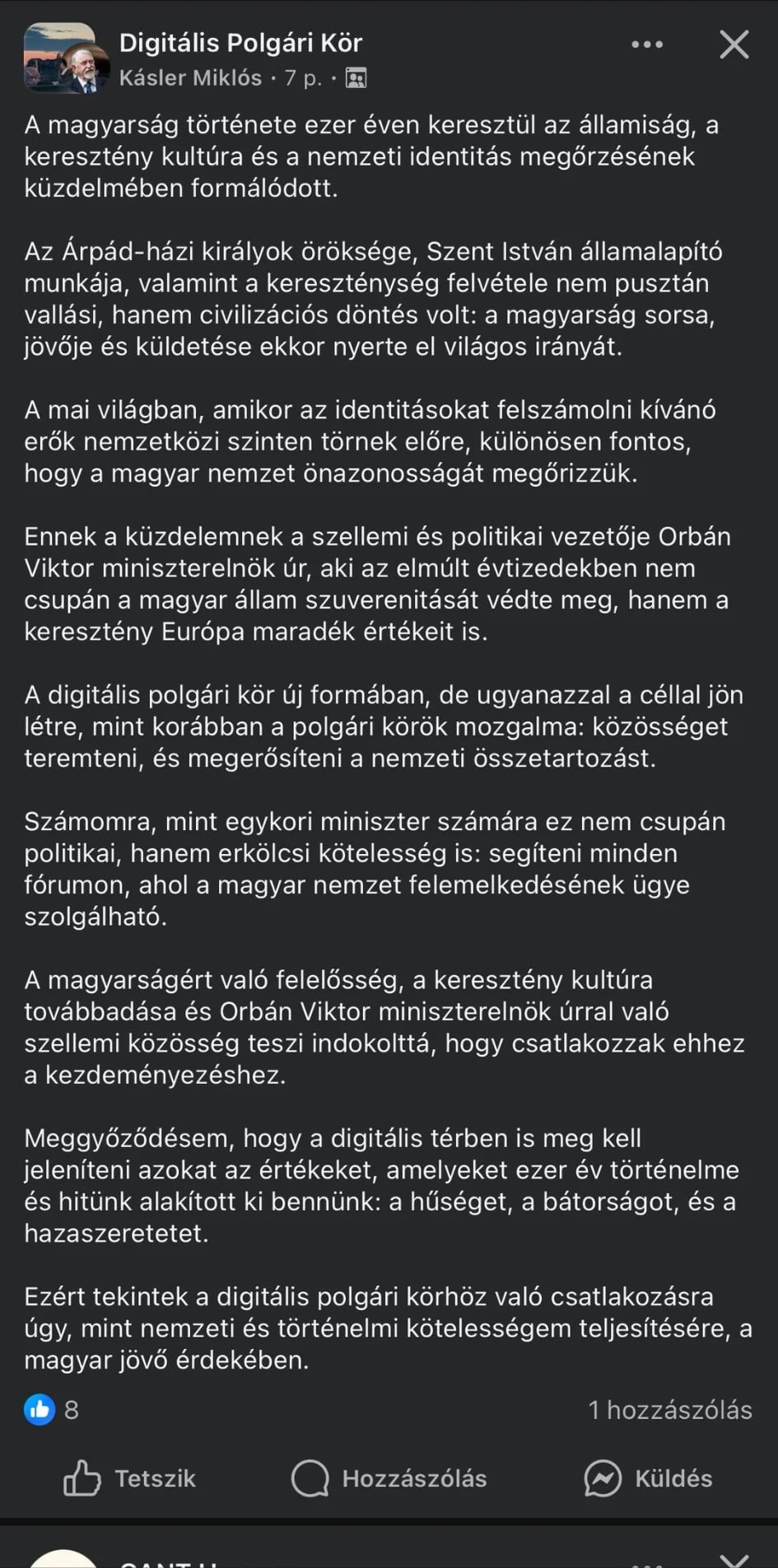 „Számomra, mint egykori miniszter számára ez nem csupán politikai, hanem erkölcsi kötelesség is: segíteni minden fórumon, ahol a magyar nemzet felemelkedésének ügye szolgálható” – talán ez a legbizarrabb mondat, amit a közel 2 hete elhunyt Kásler Miklós posztolt szerdán a DPK csoportban. A néhai miniszter azt is írta, úgy tekint a digitális polgári körhöz való csatlakozásra, mint nemzeti és történelmi kötelessége teljesítésére, a magyar jövő érdekében.
