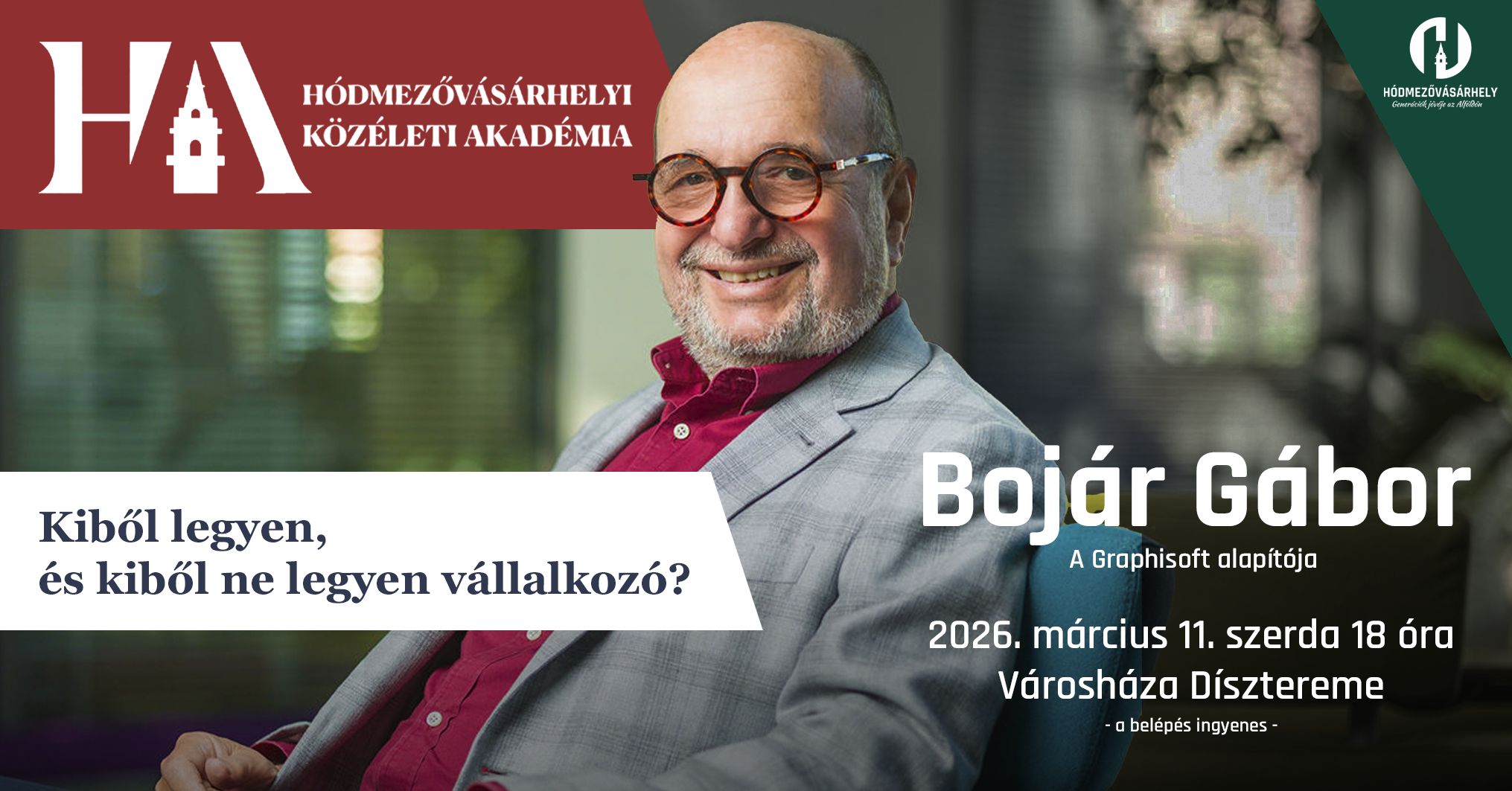 Bojár Gábor, a Graphisoft alapítója március 11-én, szerdán 18 órától a városháza dísztermében tart előadást „Kiből legyen, és kiből ne legyen vállalkozó?” címmel. A program ingyenes, a közéleti akadémia tagjait azonban kérik, hogy hozzák magukkal tagkönyvüket.