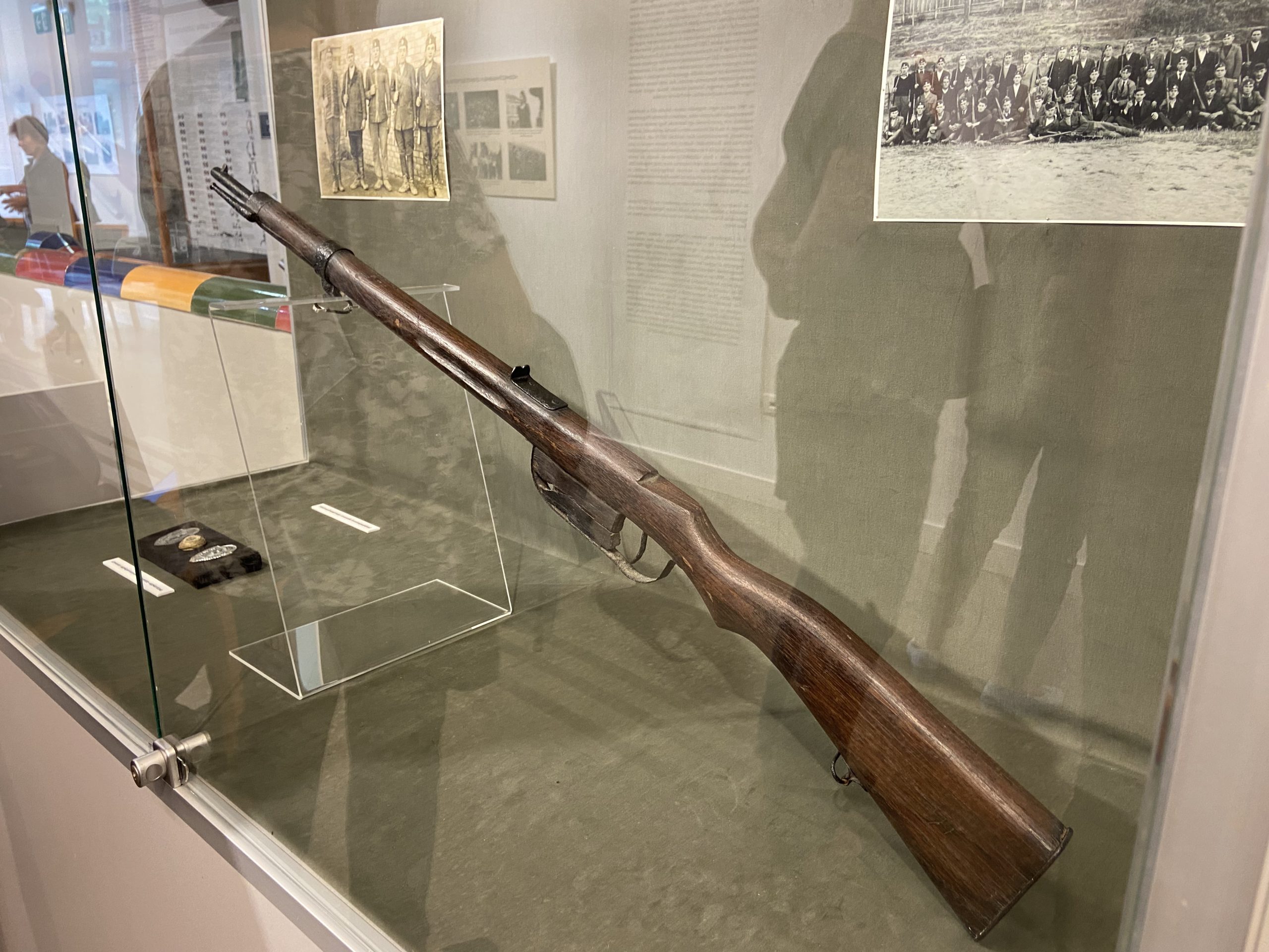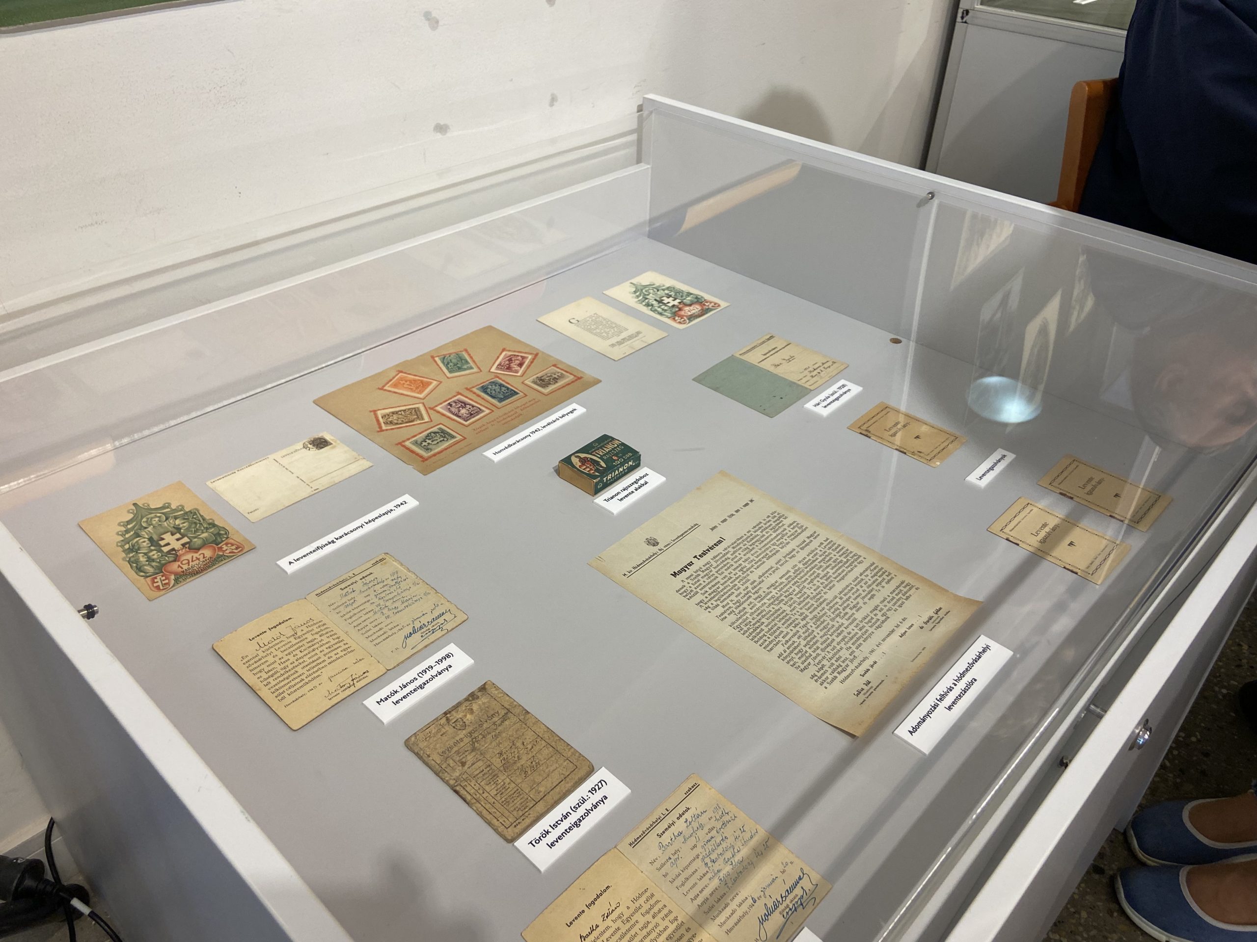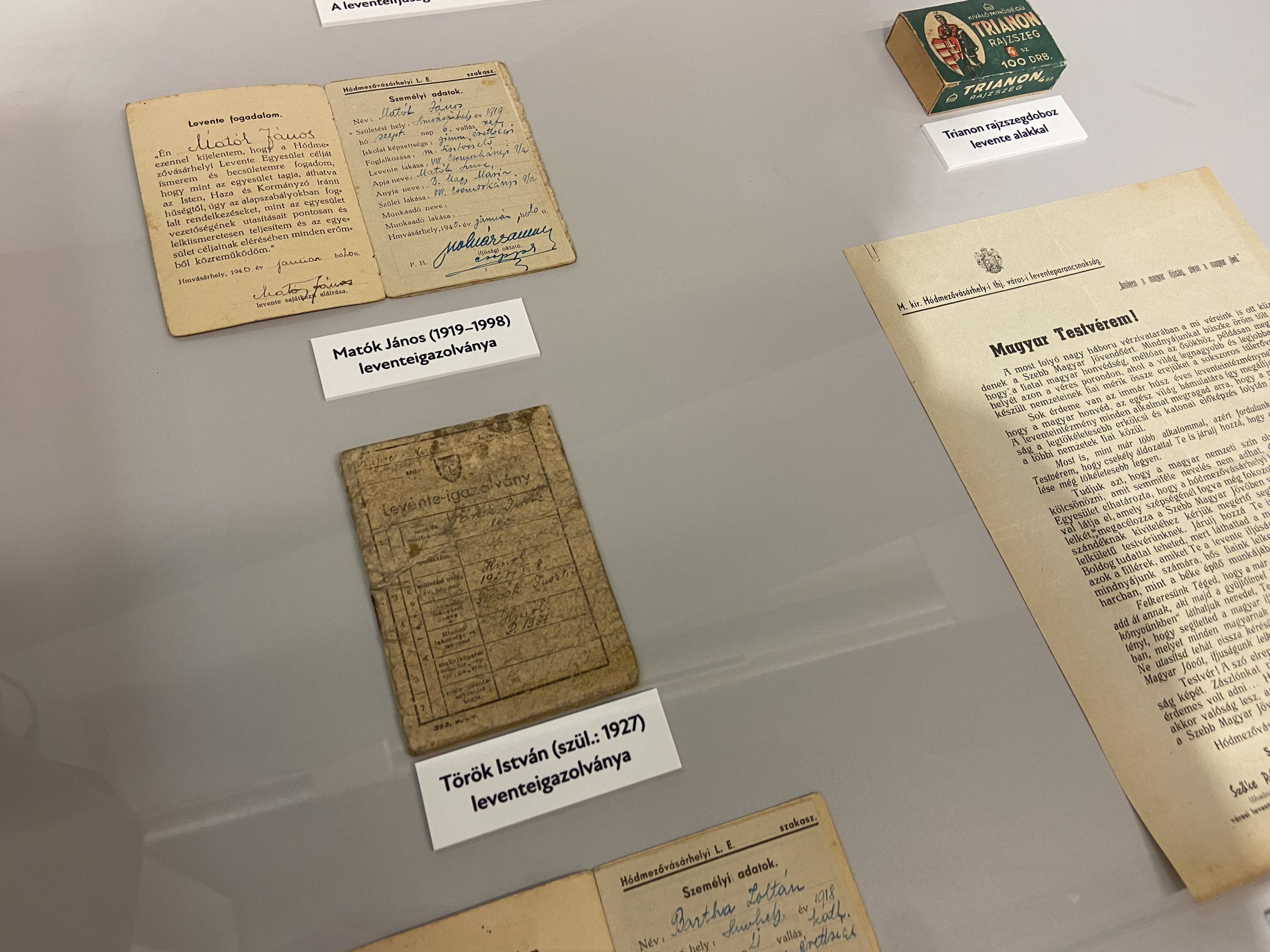 A tárlaton a gazdag képanyag mellett leventerelikviák is megtekinthetők: igazolványok, kiadványok és sapkajelvények, de még egy leventepuska is helyet kapott az egyik vitrinben.
