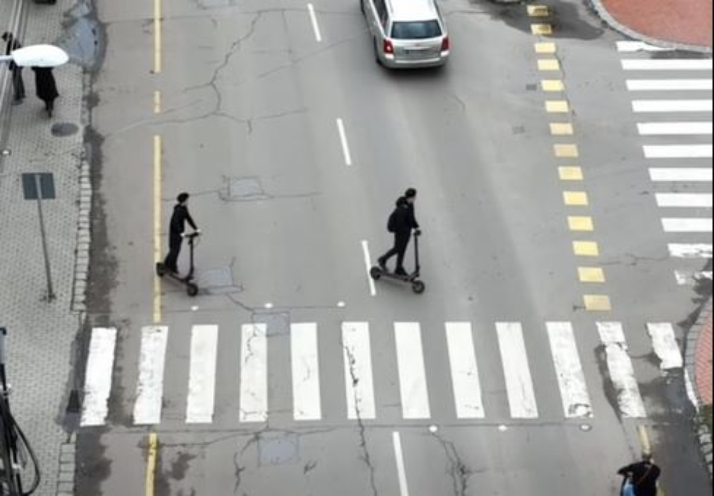Két e-rolleres meglehetősen eszetlenül kerül az út egyik oldaláról a másikra. Egyikük azt sem tudja eldönteni, hogy akkor most ő kerekes vagy gyalogos. És persze nem jelzik, hogy átmennek a túloldalra és hátra nem néznek.