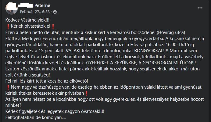 „Múlt hétfő délután mentünk a kisfiunkért a kertvárosi bölcsődébe. Előtte a Medgyesi Ferenc utcán megálltunk, hogy bemenjünk a gyógyszertárba. Az autónkkal nem a gyógyszertár oldalán, hanem a túloldalon parkoltunk le, közel a Hóvirág utcához. Körülbelül 16:00 és 16:15 között álltunk ott. Ez alatt a 15 perc alatt valaki teletömte a kipufogónkat rongyokkal!” – panaszolta egy vásárhelyi anyuka a Hódmezővásárhely – csevegő csoportban.