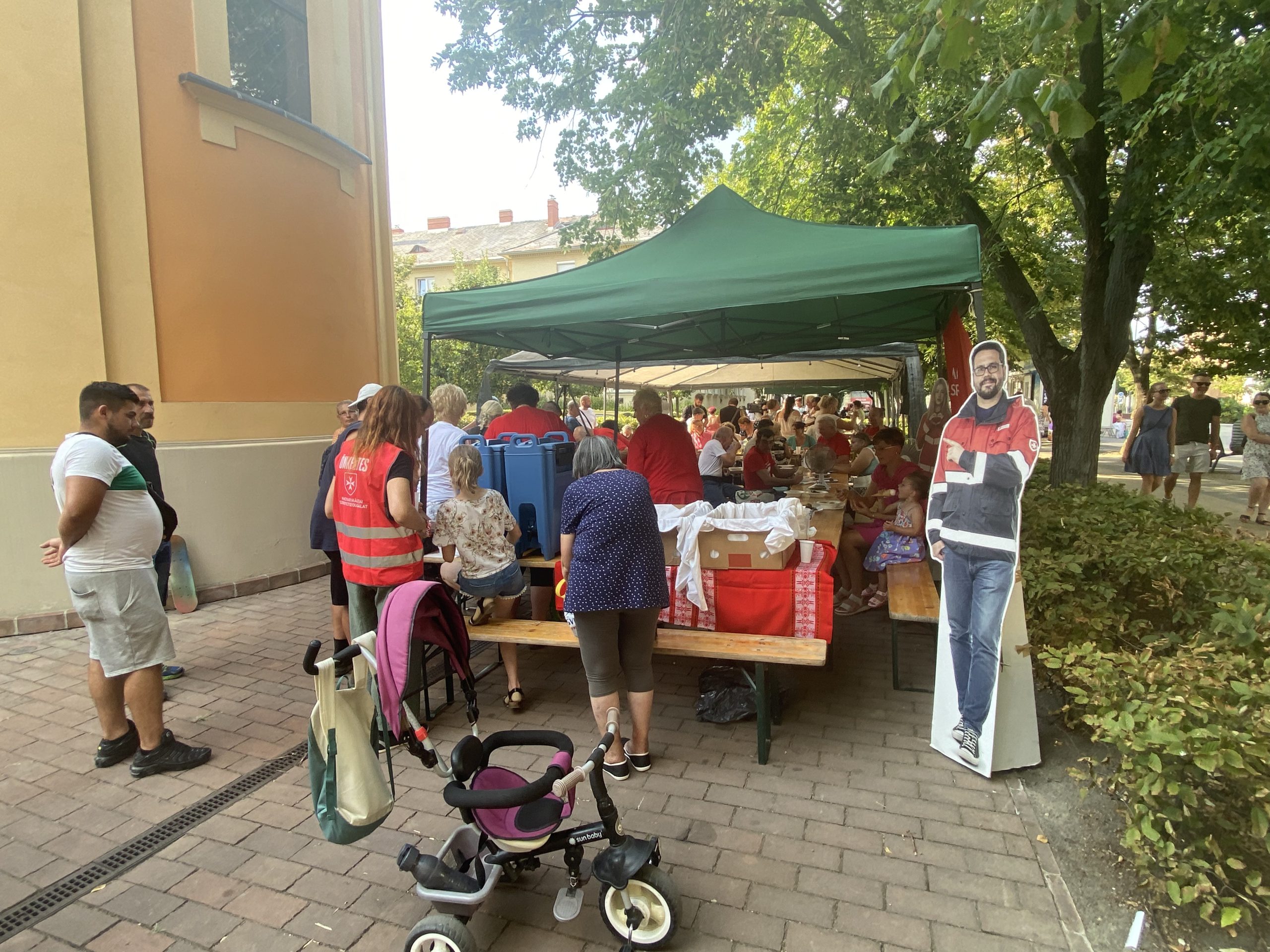 Amikor a máltaik sátrához jutok, ők már javában osztják a kóstolókat. Már három évvel ezelőtt, 2022-ben is itt voltak – akkor első alkalommal. “A mostani pedig egy különleges, mert 50 éves a Máltai Szeretetszolgálat, tehát egyben egy jubileum is” – tudtam meg vezetőjüktől, Mérai Józseftől. ”Itt van a teljes gárda, tizennyolcan vagyunk” – tette még hozzá. Az ételhez József saját készítésű kovászos uborkát hozott, de még hideg üdítőt is kínálnak a tikkadt vásárhelyieknek, sőt, desszertnek Fornetti meggyes sütit is. A máltaisok megadják a módját, mind ízben, mind dizájnban: “Lehessen érzékelni, hogy élünk, van ízünk, van zamatunk, van itt vagyunk” – fogalmazott viccelődve.