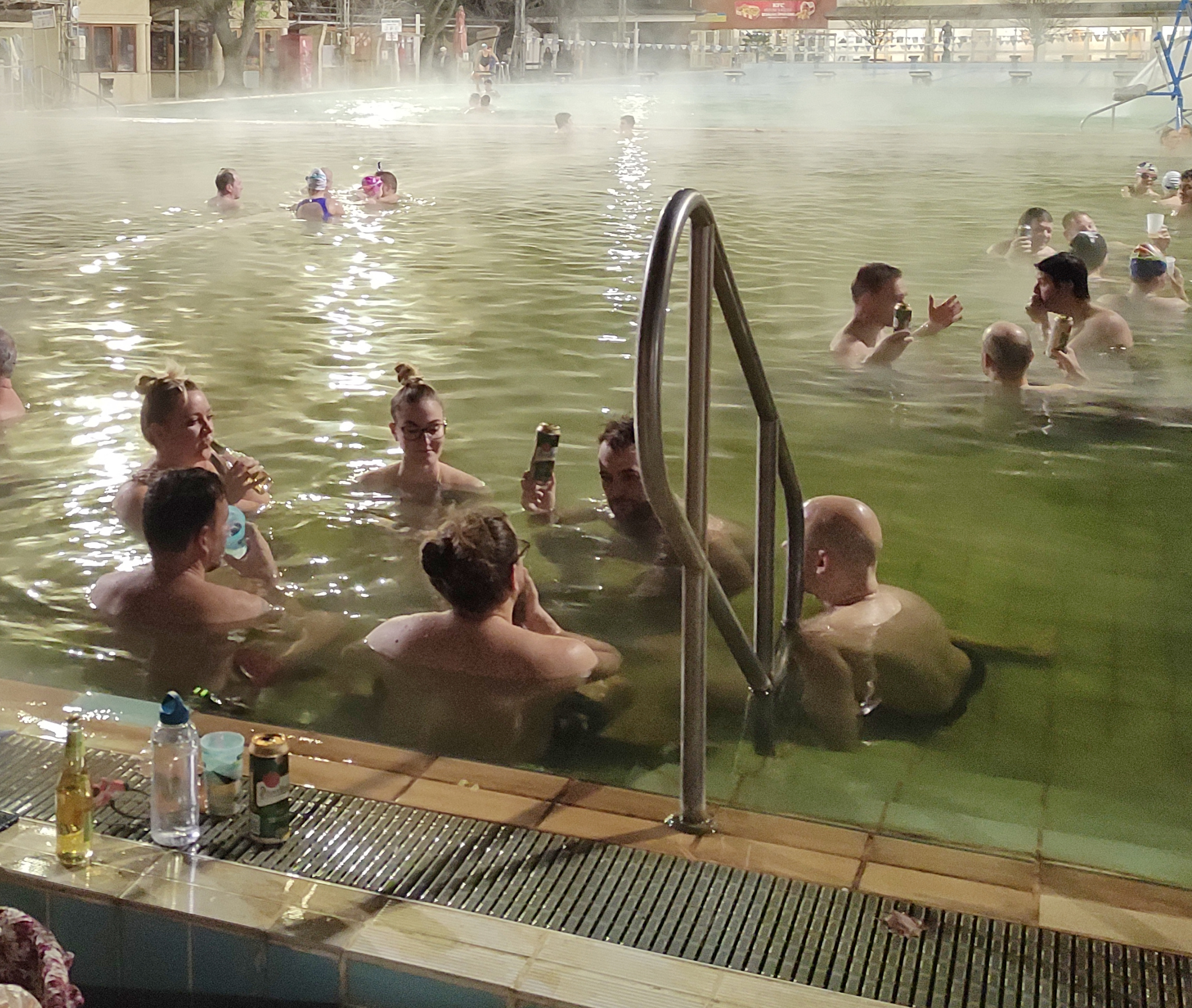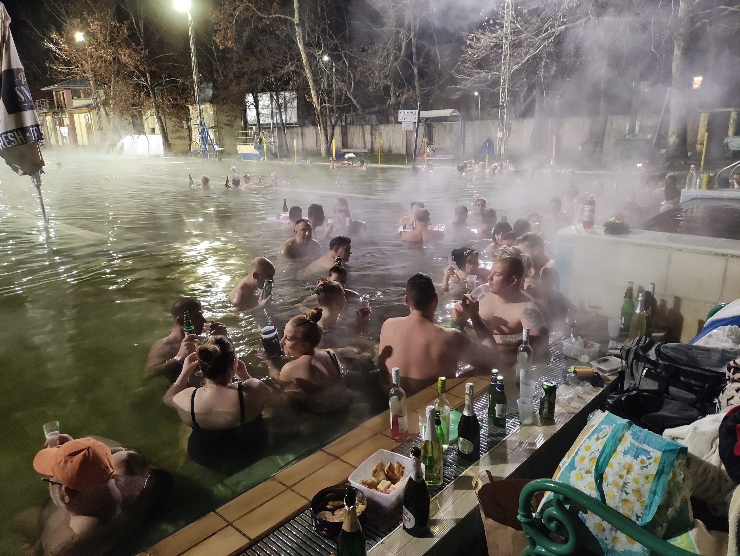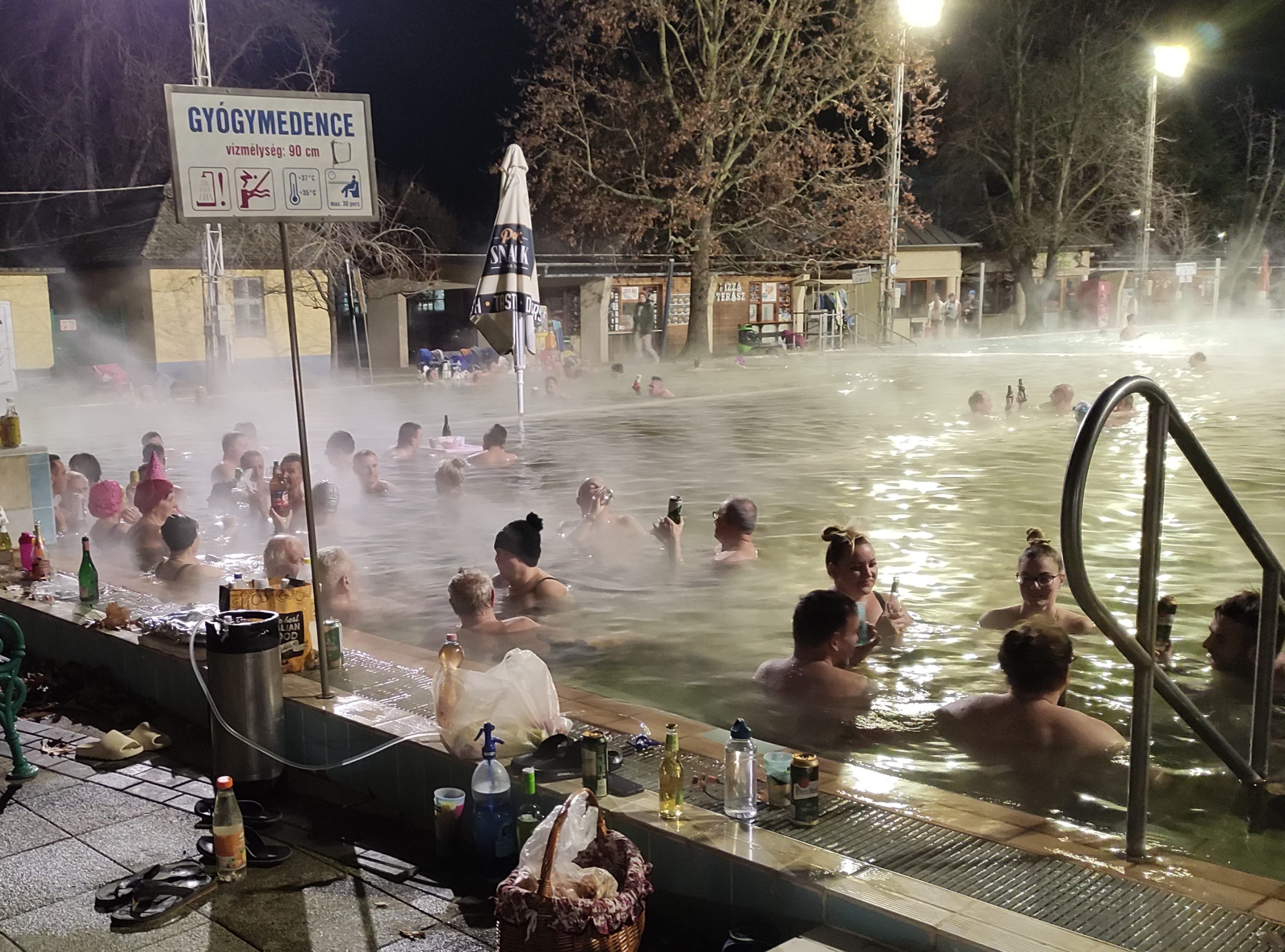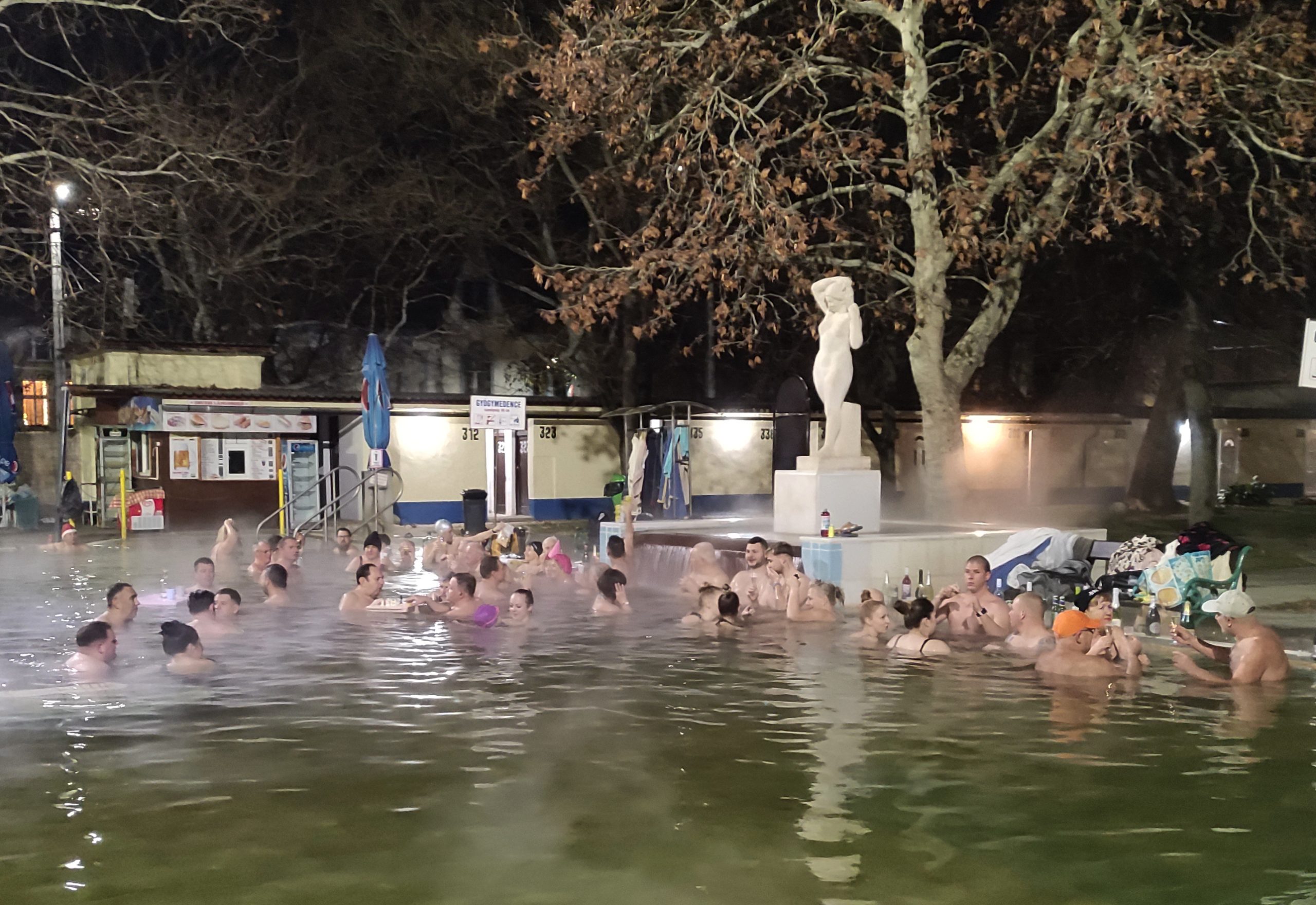 A hagyományos, éjfélig tartó éjszakai fürdőzés ezúttal is megmozgatta a baráti társaságokat, a munkahelyi közösségeket és a családokat. A csípős levegőben különösen jól esett mindenkinek a termálvíz szó szerint testet-lelket melengető hőmérséklete. Így aztán csak néhány fiatalabb vendég játszott a középső medencében, a többség inkább a termálvízben üldögélt. Akadtak olyanok is, akik egyenesen a Medgyessy Ferenc 1956 óta itt álló Debreceni Vénusz szobrának medencéjébe másztak bele, ahol még forróbb a víz.