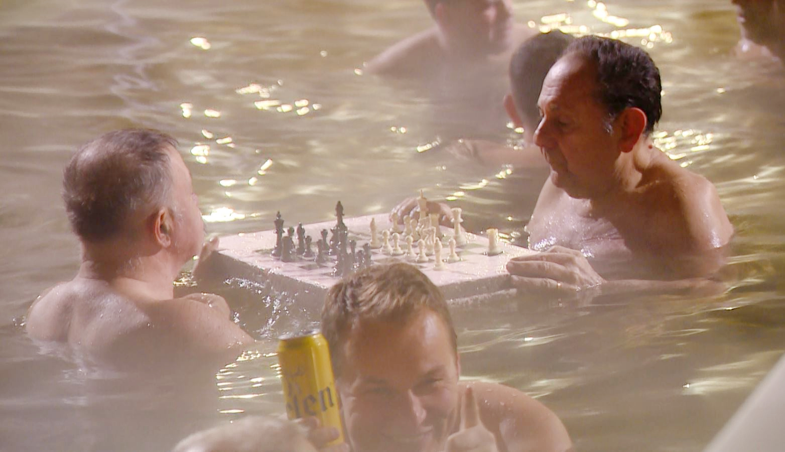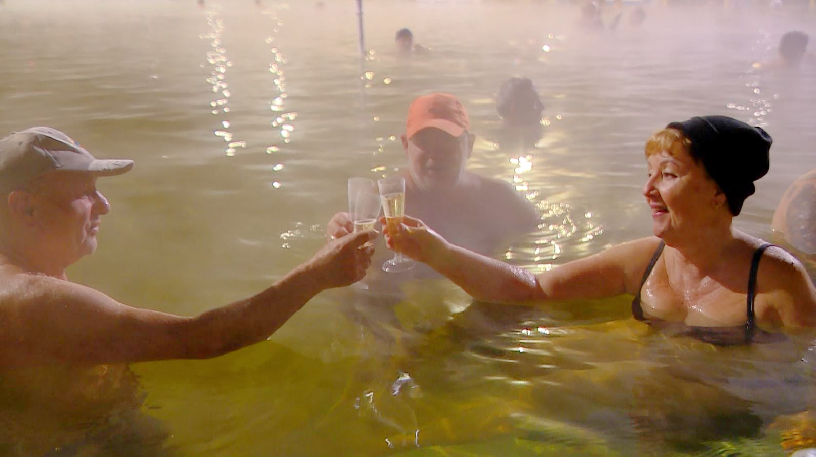 A termálvíz felett gomolygó sűrű pára időnként teljesen elrejtette a fürdőzőket, majd egy-egy fuvallat újra felfedte őket – néha még egymás előtt is. Amikor az ismerősök meg-megpillantották egymást, örömmel borultak a másik nyakába, még akkor is, ha törzsvendégként szinte minden nap együtt úsznak.