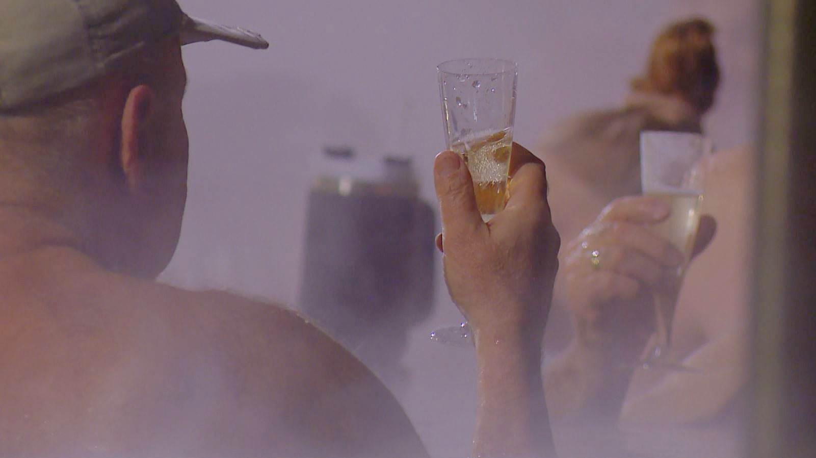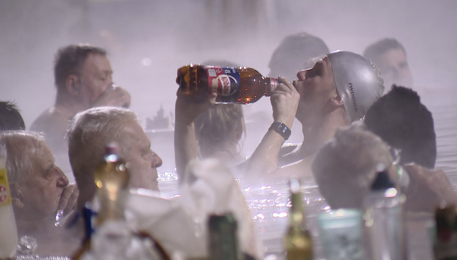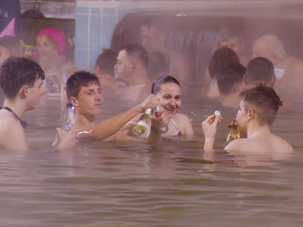 A fürdőzők a hagyományoknak megfelelően nemcsak lubickoltak, hanem söröztek és pezsgőztek is a vízben, így várva az éjféli zárórát.
