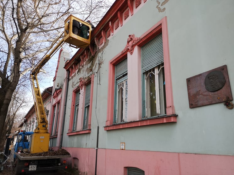 Veszélyesnek ítélték a vásárhelyi könyvtár homlokzatát, ezért ma elszalagozták az előtte lévő közterületet. A problémát még délelőtt elhárították: szakemberek levették és biztonságba helyezték a meglazult homlokzati díszítőelemeket. Az emelőkosárból egyúttal az ereszcsatornában összegyűlt falevelet, gallyakat és az egyéb szennyeződéseket is eltávolították. Az, hogy a könyvtár homlokzata leromlott, információink szerint többek között ennek is köszönhető, azaz az eltömődött csatornának, amelyből nem tud szabadon lefolyni a csapadék.
