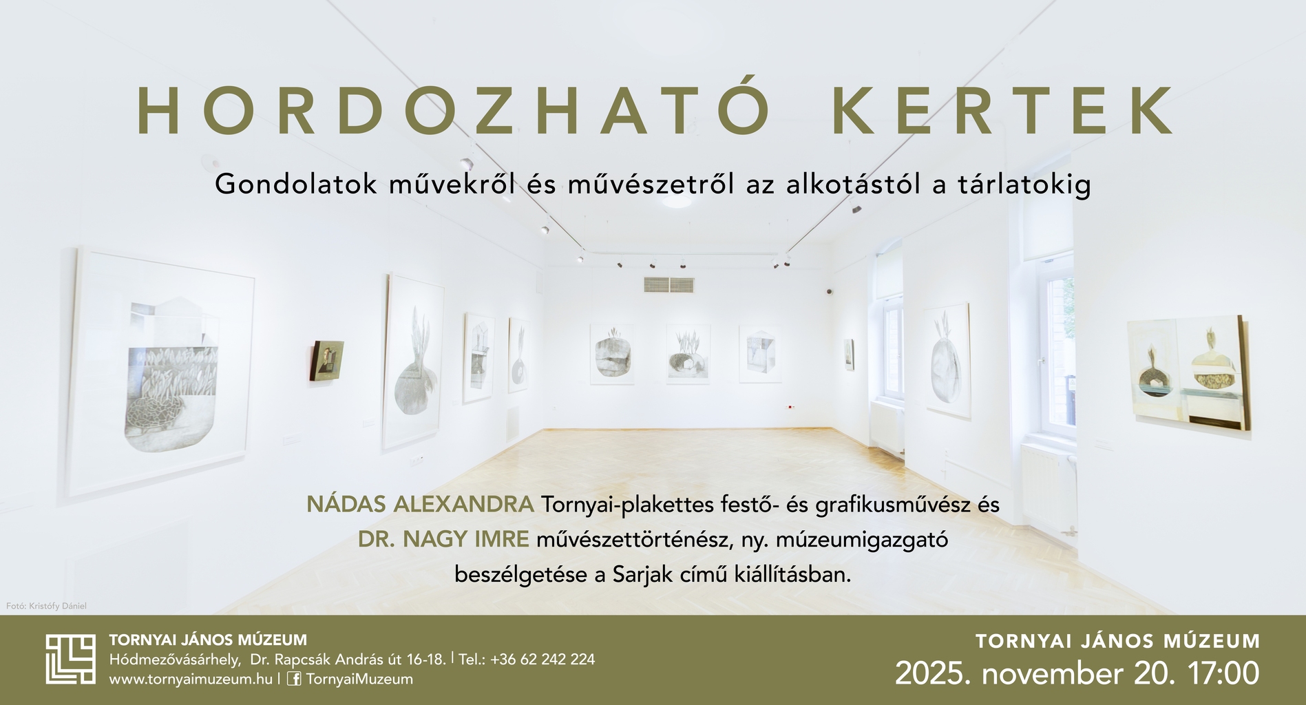 A Tornyai-múzeum földszintjén Nádas Alexandra, a tavalyi Vásárhelyi Őszi Tárlat fődíjas alkotójának kiállításában Dr. Nagy Imre művészettörténész és az alkotó közösen fogalmaznak meg olyan gondolatokat, amelyek átfonják a kiállított műveket a Hordozható kertektől egészen a címadó Sarjakig. A beszélgetés 20-án 17 órakor kezdődik.