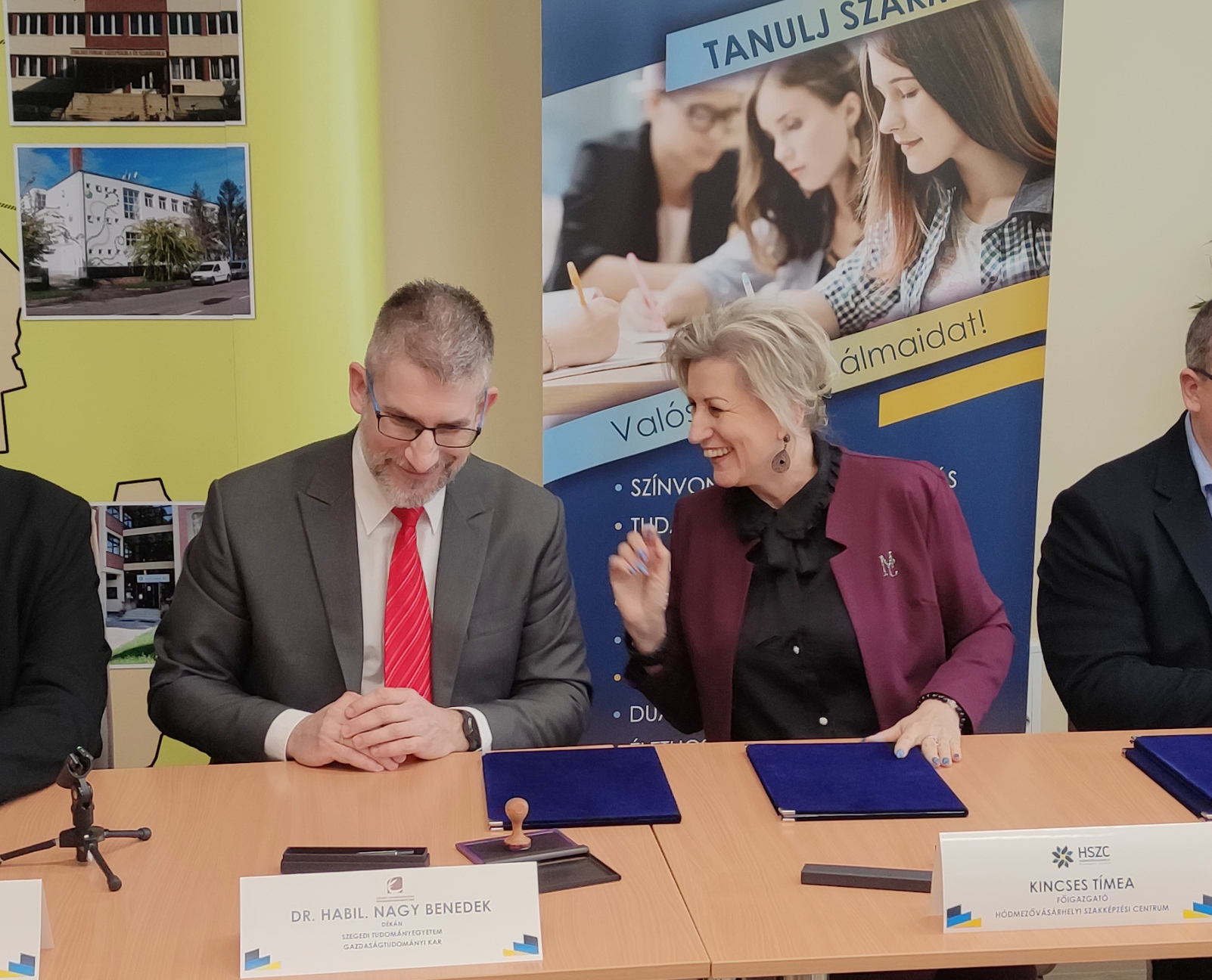 A Hódmezővásárhelyi Szakképzési Centrum a Szegedi Tudományegyetem Gazdaságtudományi Karával kötött együttműködési megállapodásokat ma délelőtt. A dokumentumot Kincses Tímea, a HSZC főigazgatója, Ambrus Norbert kancellár és Nagy Benedek, a kar dékánja, illetve a HSZC-hez tartozó iskolák igazgatói írták alá.