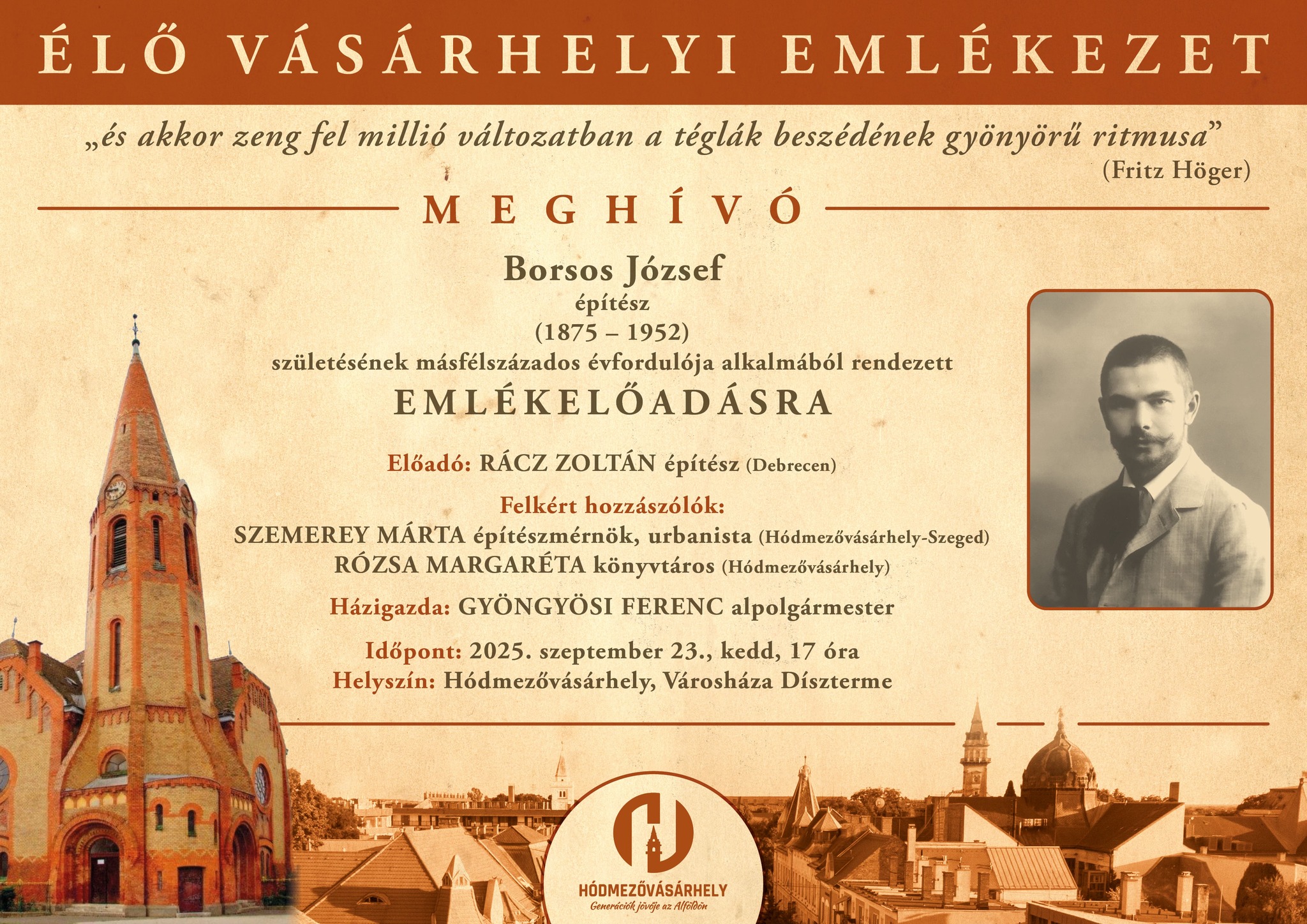 A kiemelkedő vásárhelyi építész születésének 150. évfordulóján Rácz Zoltán debreceni építész tart előadást, amelyhez felkért hozzászólóként Szemerey Márta építészmérnök, urbanista és Rózsa Margaréta könyvtáros is csatlakozik. A rendezvény házigazdája Gyöngyösi Ferenc alpolgármester lesz.