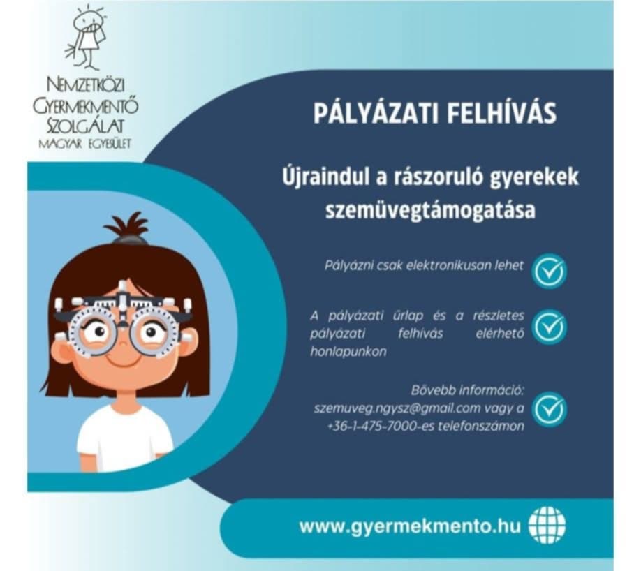 Továbbra is lehet pályázni a Nemzetközi Gyermekmentő Szolgálat Magyar Egyesülete által meghirdetett szemüvegtámogatásra a rendelkezésre álló keret erejéig. A program célja, hogy a hátrányos helyzetű gyermekek látáskorrekciós szemüveghez juthassanak, ezzel javítva életminőségüket és iskolai teljesítményüket. A pályázat lebonyolításában idén is aktív szerepet vállal a Hódmezővásárhelyi Cigány Nemzetiségi Önkormányzat.